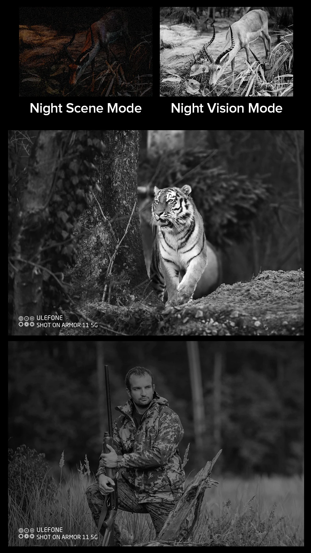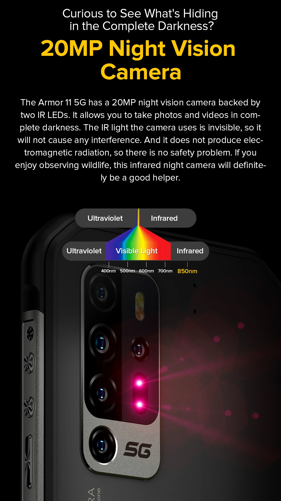 La Armor 11 5G tiene una cámara de visión nocturna de 20MP respaldada por dos LED IR.Te permite tomar fotos y vídeos en completa oscuridad.La luz IR que utiliza la cámara es invisible, por lo que no causará ninguna interferencia.Y no produce radiación electromagnética, por lo que no hay ningún problema de seguridad.Si disfruta observando la vida silvestre, esta cámara nocturna infrarroja definitivamente será una buena ayuda.