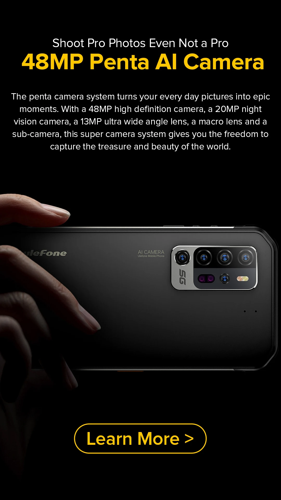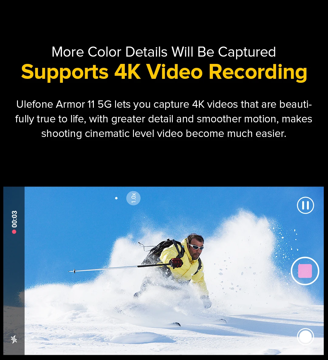 Ulefone Armor 11 5G te permite capturar vídeos 4K que son maravillosamente fieles a la vida, con mayores detalles y movimientos más fluidos, lo que hace que grabar videos de nivel cinematográfico sea mucho más fácil.