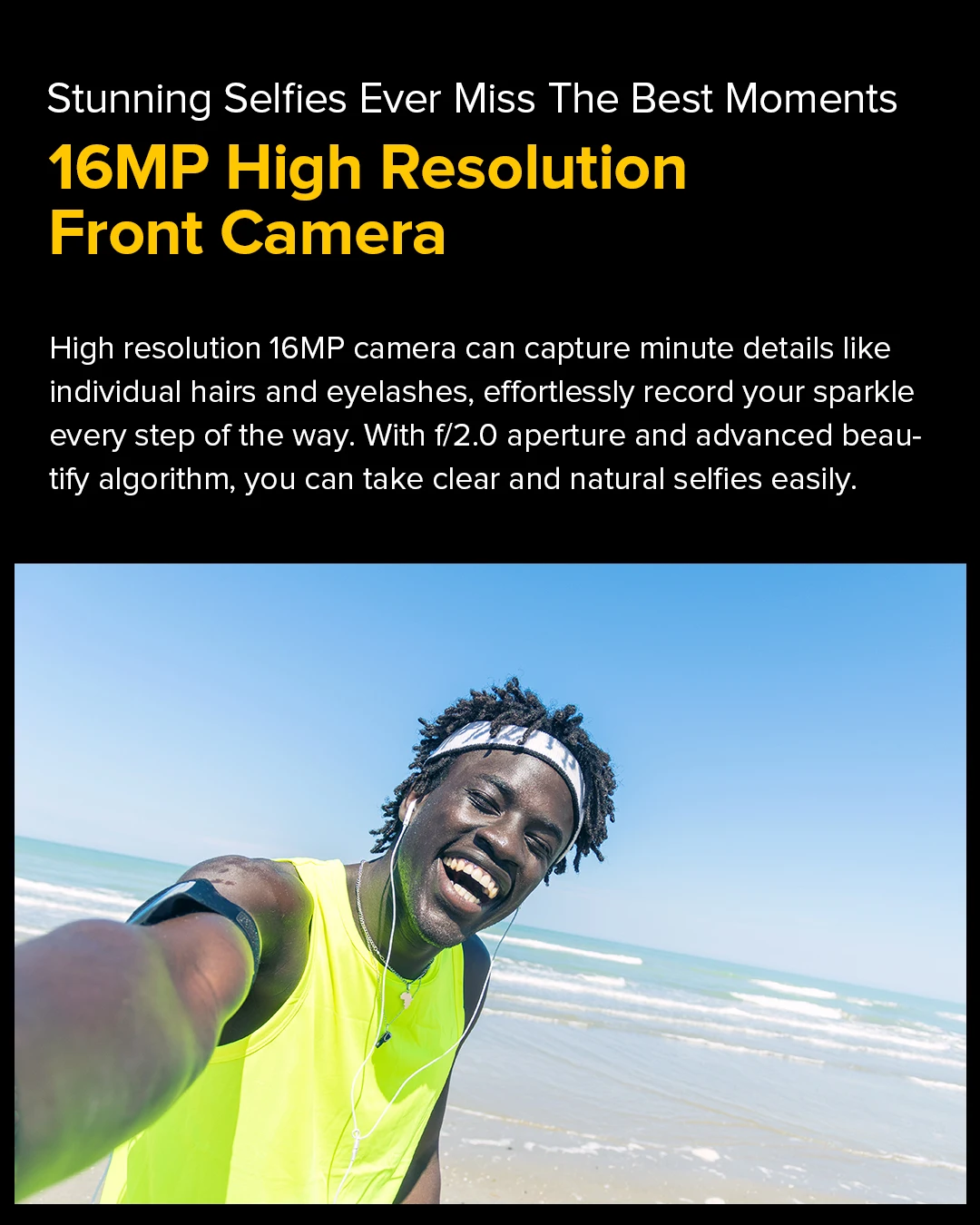 La cámara de alta resolución de 16 MP puede capturar detalles minutos como pelos y pestañas individuales y registrar sin esfuerzo su brillo en cada paso del camino.Con una apertura f/2.0 y un algoritmo de embellecimiento avanzado, puedes tomar selfies claros y naturales fácilmente.