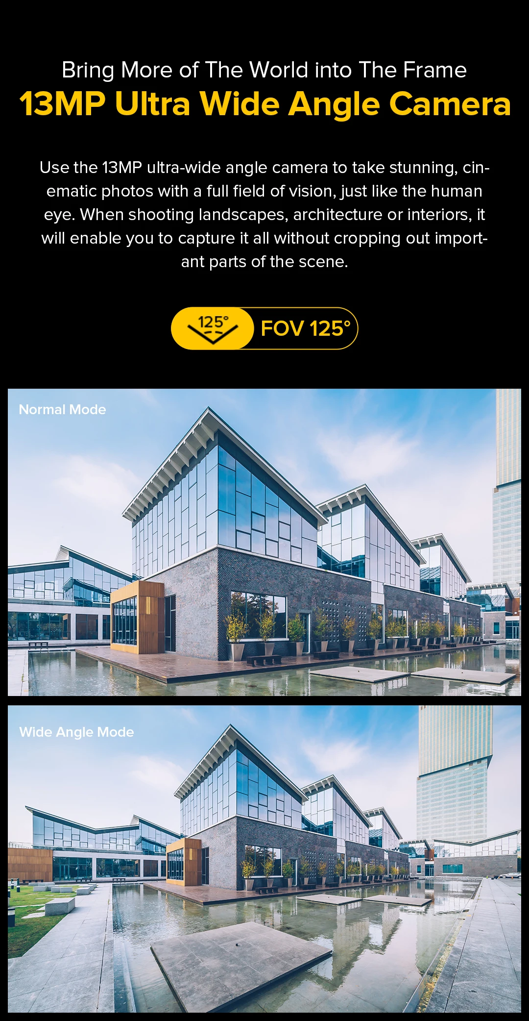 Utilice la cámara ultra gran angular de 13 MP para tomar fotografías impresionantes y cinematográficas con un campo de visión completo, como el ojo humano.Al fotografiar paisajes, arquitectura o interiores, le permitirá capturar todo sin recortar partes importantes de la escena.