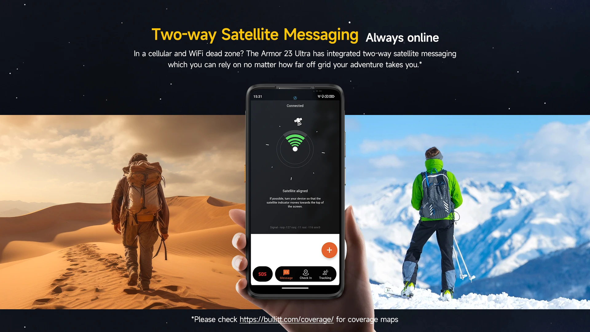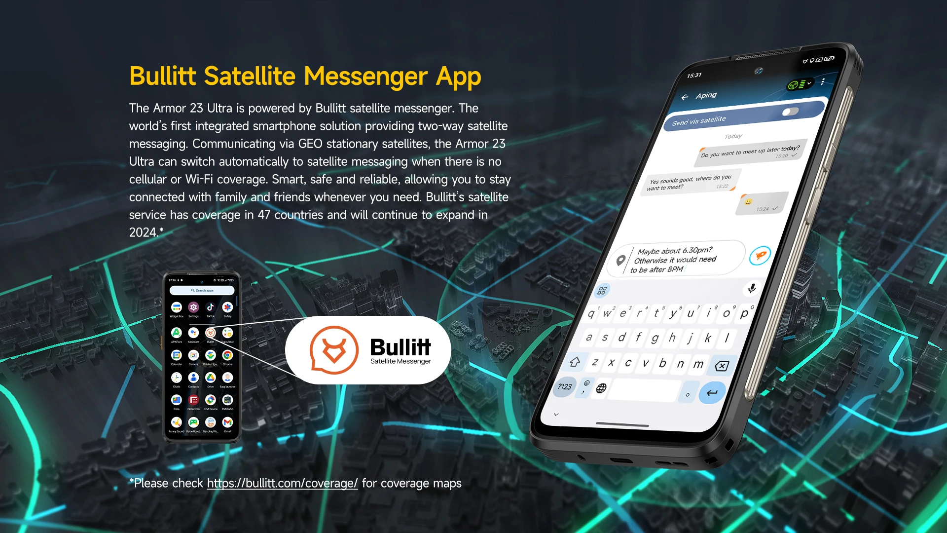 The Armor 23 Ultra is powered by Bullitt satellite messenger. The world’s first integrated smartphone solution providing two-way satellite messaging. Communicating via GEO stationary satellites, the Armor 23 Ultra can switch automatically to satellite messaging when there is no cellular or Wi-Fi coverage. Smart, safe and reliable, allowing you to stay connected with family and friends whenever you need. Bullitt’s satellite service has coverage in 47 countries and will continue to expand in 2024.