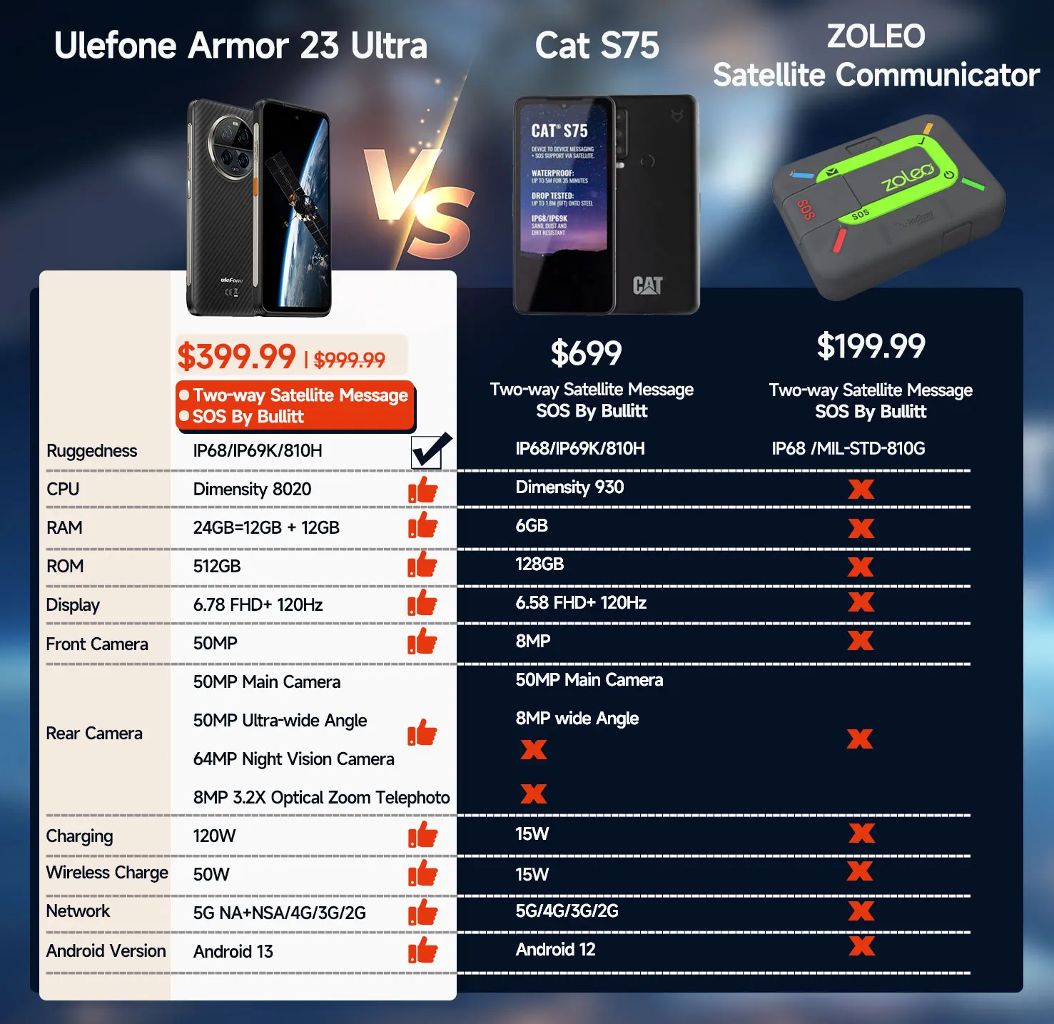 In a cellular and WiFi dead zone? The Armor 23 Ultra has integrated two-way satellite messaging which you can rely on no matter how far off grid your adventure takes you.*