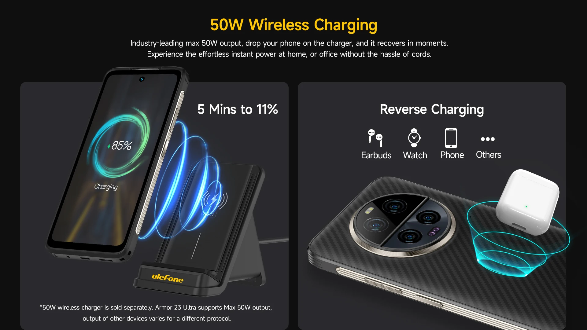 *(50W wireless charger is sold separately. Armor 23 Ultra supports Max 50W output,And only with the charger and cable that comes with Armor 23 Ultra, it can reach 50W. output of other devices varies for a different protocol.