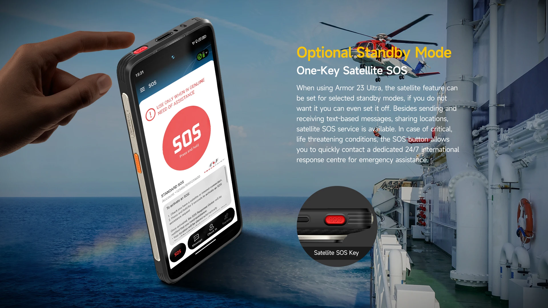 When using Armor 23 Ultra, the satellite feature can be set for selected standby modes, if you do not want it you can even set it off. Besides sending and receiving text-based messages, sharing locations, satellite SOS service is available. In case of critical, life threatening conditions, the SOS button allows you to quickly contact a dedicated 24/7 international response centre for emergency assistance.