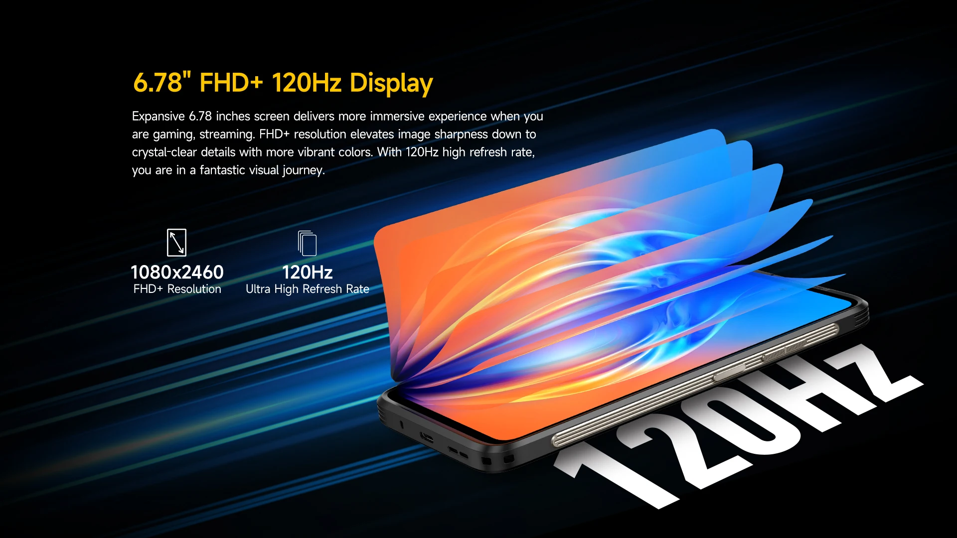 Expansive 6.78 inches screen delivers more immersive experience when you are gaming, streaming. FHD+ resolution elevates image sharpness down to crystal-clear details with more vibrant colors. With 120Hz high refresh rate, you are in a fantastic visual journey.
