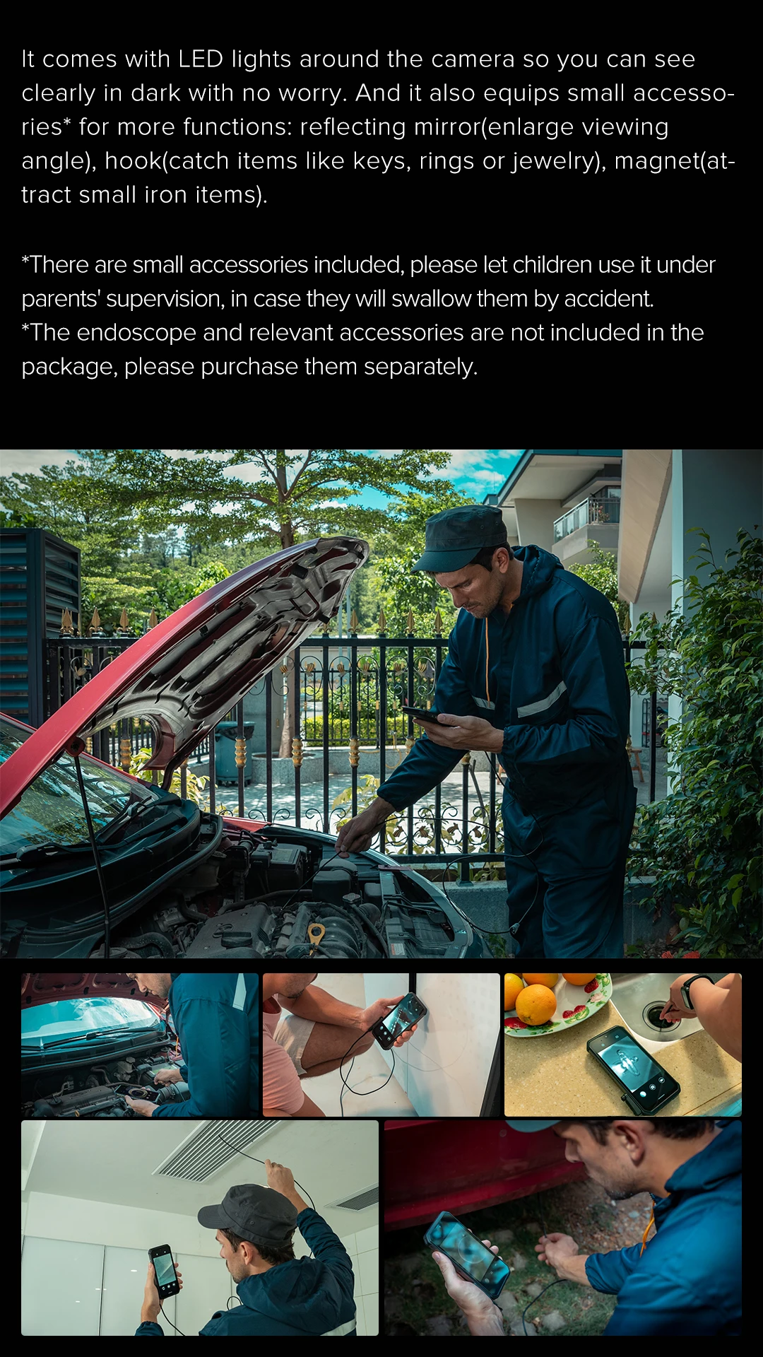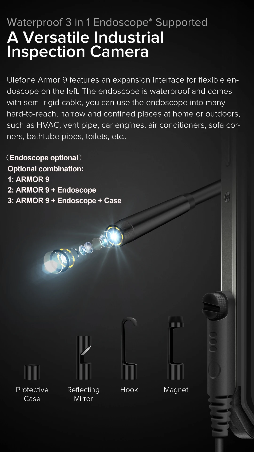 Ulefone Armor 9 cuenta con una interfaz de expansión para un endoscopio flexible a la izquierda. El endoscopio es resistente al agua y viene con un cable semirrígido, puede usar el endoscopio en muchos lugares difíciles de alcanzar, estrechos y confinados en casa o al aire libre, como HVAC, tubería de ventilación, motores de automóviles, aires acondicionados, esquinas de sofás, tuberías de bañera, inodoros, etc.