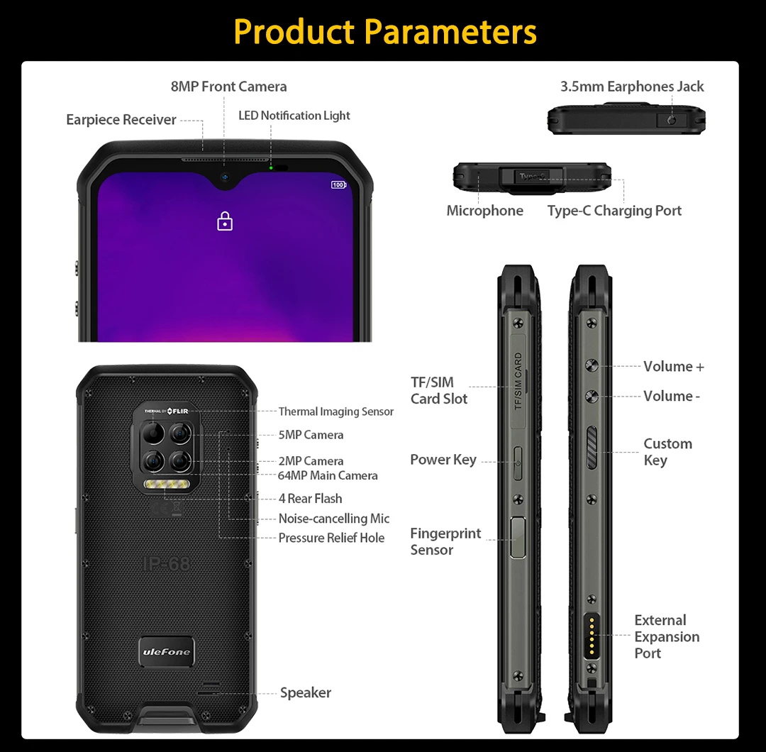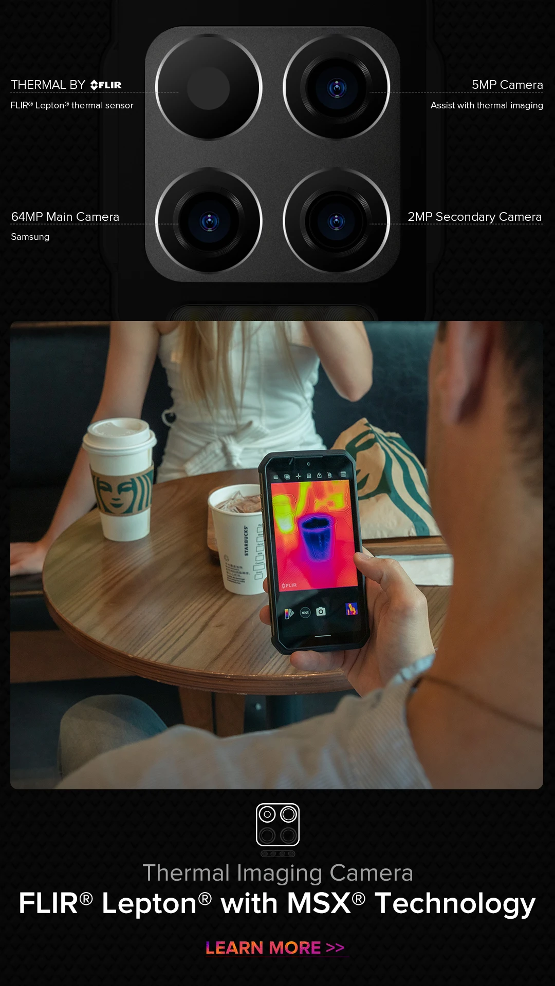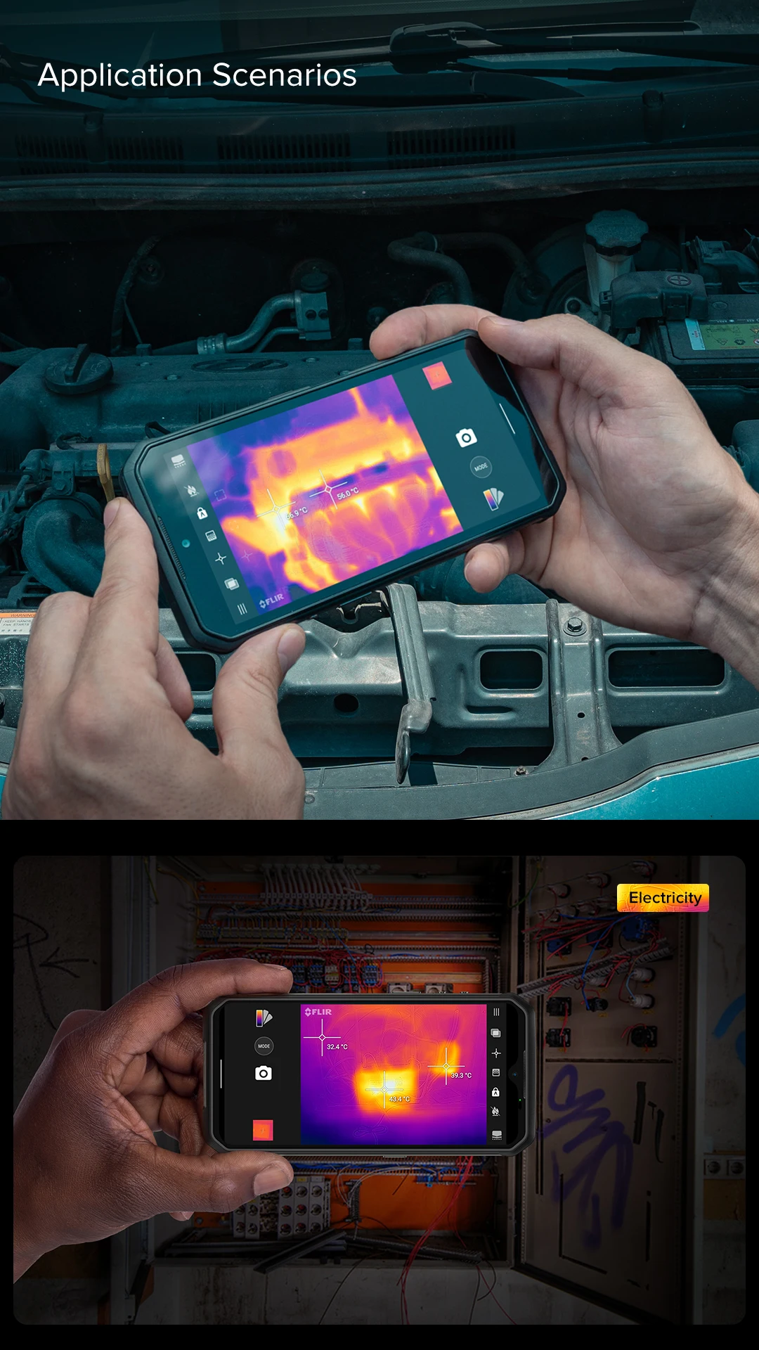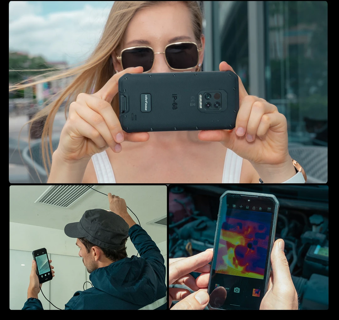 La cámara termográfica FLIR integrada, con tecnología MSX, en los teléfonos inteligentes Ulefone Armor 9 puede detectar objetos en la escena y crear imágenes térmicas basadas en la temperatura. Podrá ver anomalías como la pérdida o ganancia de calor, encontrar animales o personas en la oscuridad y diagnosticar y resolver problemas rápidamente. Una cámara de imagen térmica puede jugar un papel importante en el mantenimiento eléctrico y de tuberías, aventuras al aire libre, rescates de emergencia y más.