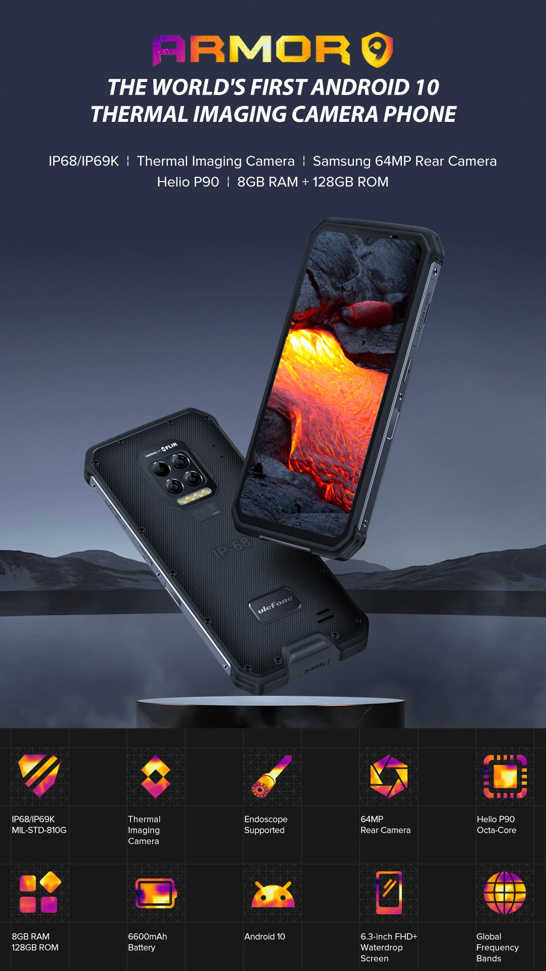 Ulefone-Smartphone Armor 9 robusto con cámara térmica 64 MP, teléfono móvil con Android 10, Helio P90 de ocho núcleos Octa-core 8GB + 128GB, equipado de batería de 6600mAh