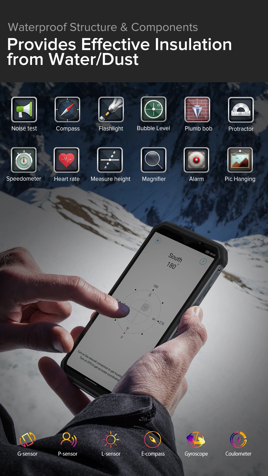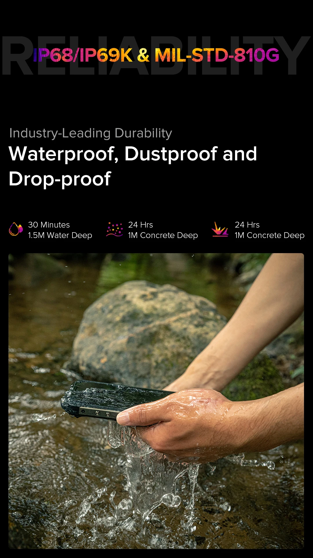 * El teléfono resistente Ulefone es resistente al agua y al polvo. Se probó con una calificación de IP68 en condiciones de laboratorio controladas según la norma IEC 60529 (profundidad máxima de 1,5 metros hasta 30 minutos). La resistencia al agua y al polvo no son condiciones permanentes, y la resistencia puede disminuir como resultado del desgaste normal. No intente cargar un teléfono mojado; consulte la Guía del usuario para obtener instrucciones de limpieza y secado. Los daños por líquidos no están cubiertos por la garantía.