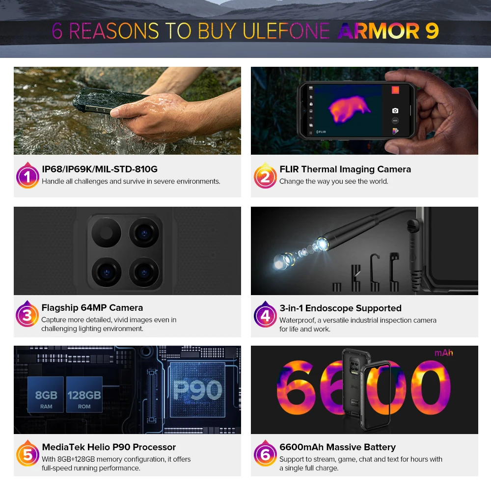 Ulefone-Smartphone Armor 9 robusto con cámara térmica 64 MP, teléfono móvil con Android 10, Helio P90 de ocho núcleos Octa-core 8GB + 128GB, equipado de batería de 6600mAh