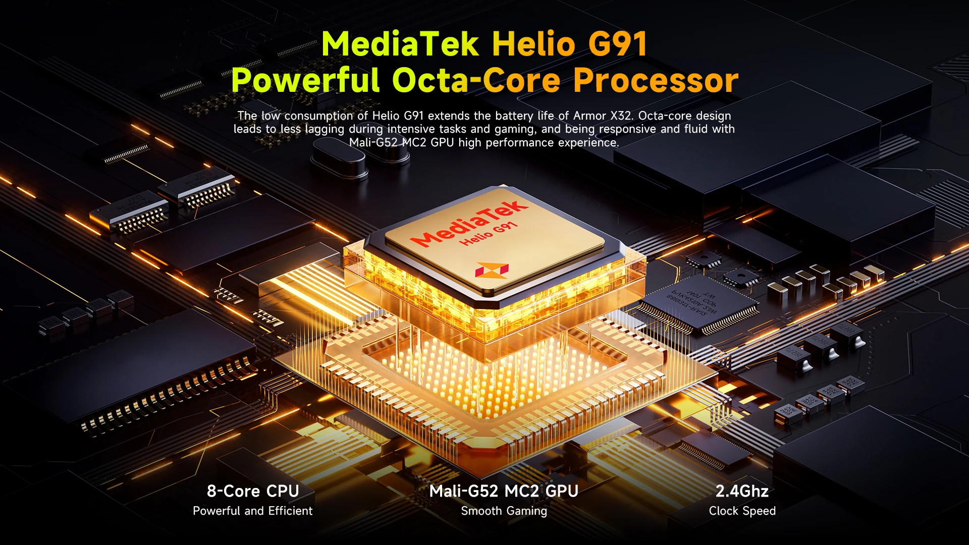 El bajo consumo de Helio G91 extiende la duración de la batería de Armor X32.El diseño Octa-core conduce a reducir retrasos durante tareas y juegos intensivos, y a ser receptivo y fluido con la experiencia de alto rendimiento de la GPU Mali-G52 MC2.