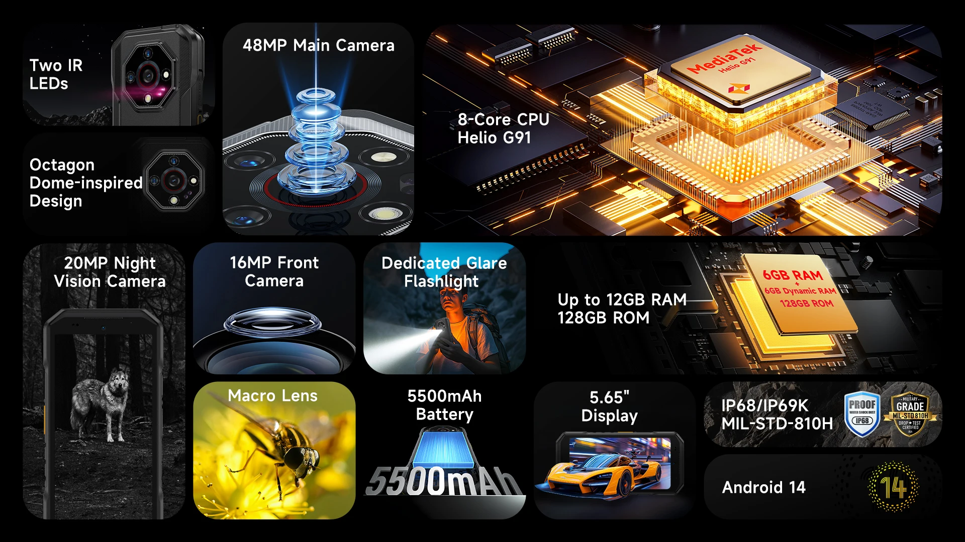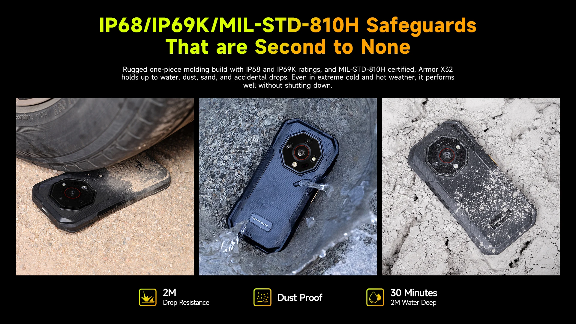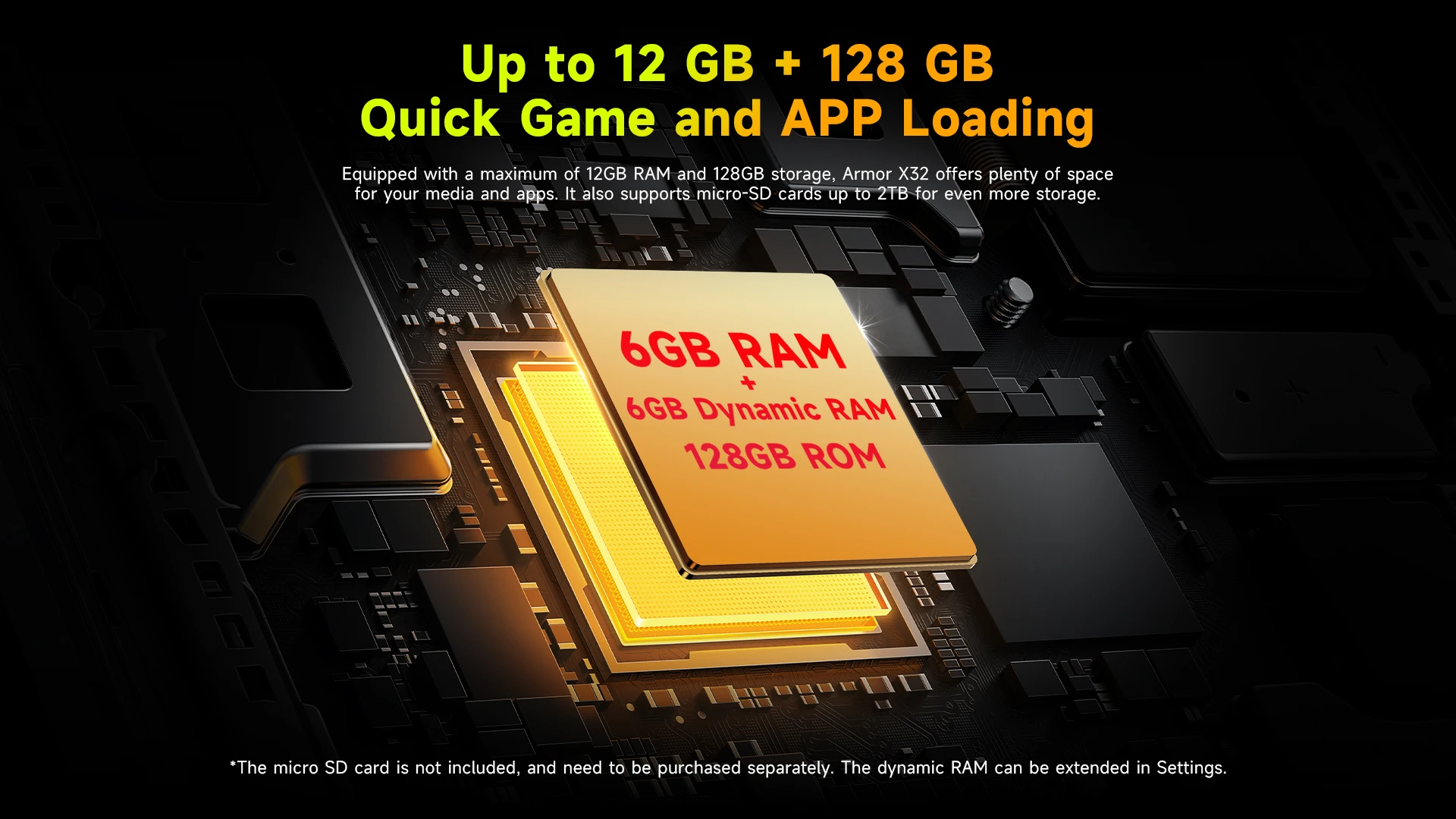 Equipado con un máximo de 12 GB de RAM y 128 GB de almacenamiento, Armor X32 ofrece mucho espacio para sus medios y aplicaciones.También admite tarjetas micro-SD de hasta 2 TB para obtener aún más almacenamiento.