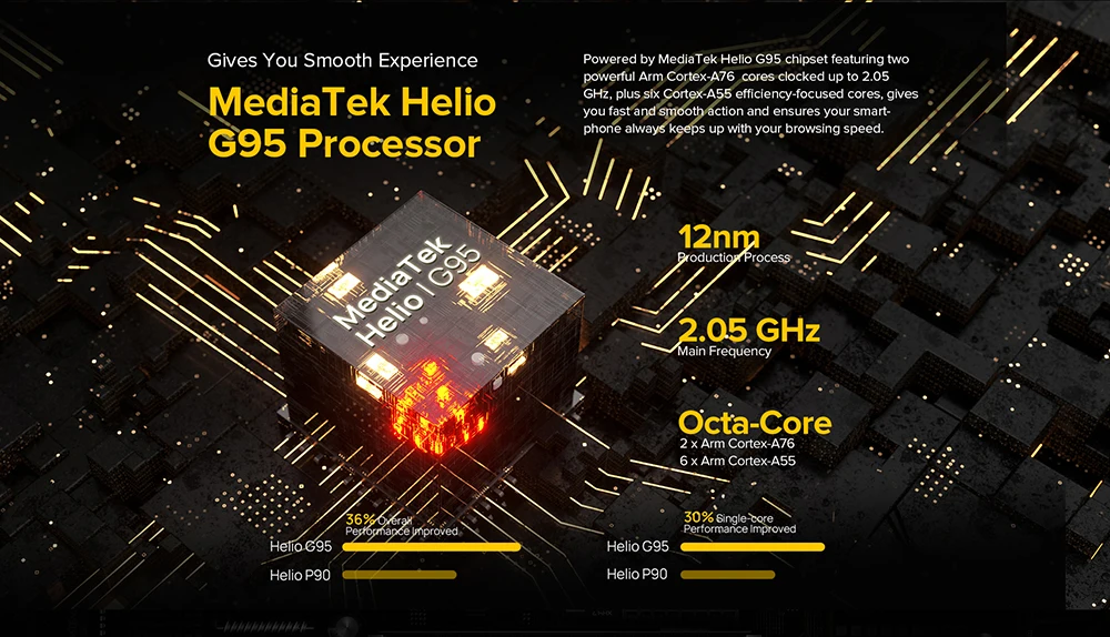 Powered by MediaTek Helio G95 chipset featuring two powerful Arm Cortex-A76 cores clocked up to 2.05GHz, plus six Cortex-A55 efficiency-focused cores, gives you fast and smooth action and ensures your smartphone always keeps up with your browsing speed.