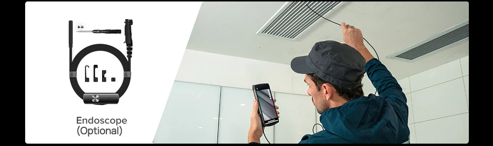 Features an expansion interface for connecting with flexible endoscope on the left. It can be used with endoscope to peek into hard-to-see areas, narrow or confined areas at home or outdoors to clean HVAC, vent pipes, car engines, air conditioners, sofa corners, bathtub pipes, toilets and etc. thoroughly.