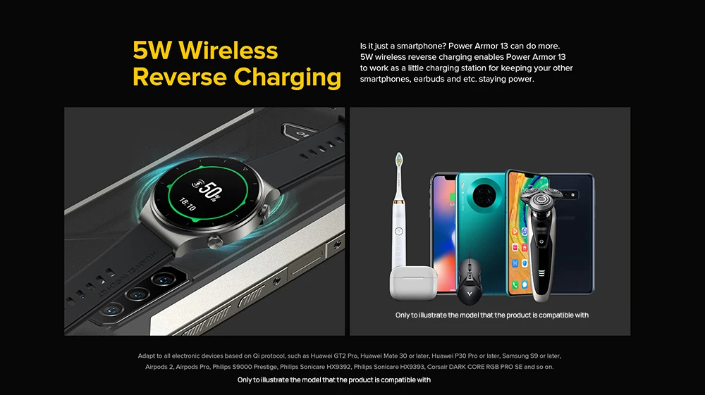 *The wireless reverse charging function only supports charging devices that support Qi protocol. The devices currently available are as shown in the table below, other equipment is not guaranteed to work normally.