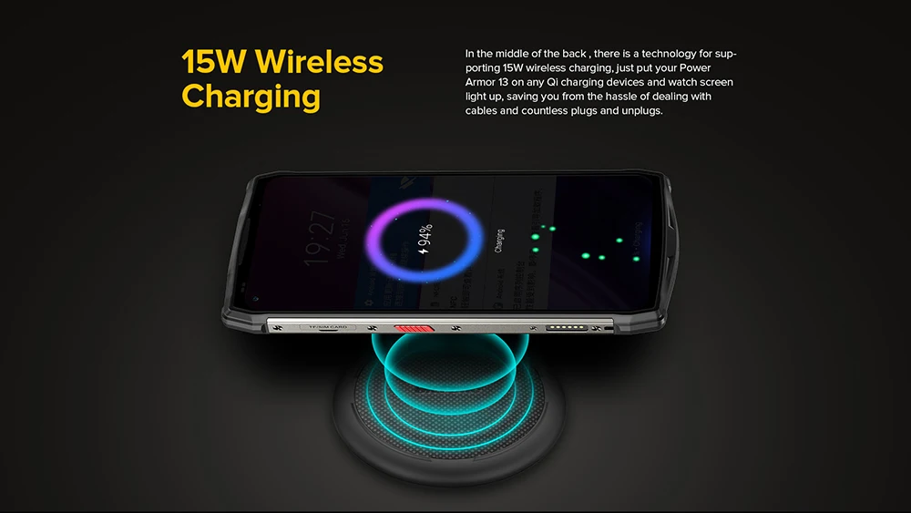 In the middle of the back, there is a technology for supporting 15W wireless charging, just put your Power Armor 13 on any Qi charging devices and watch screen light up, saving you from the hassle of dealing with cables and countless plugs and unplugs.