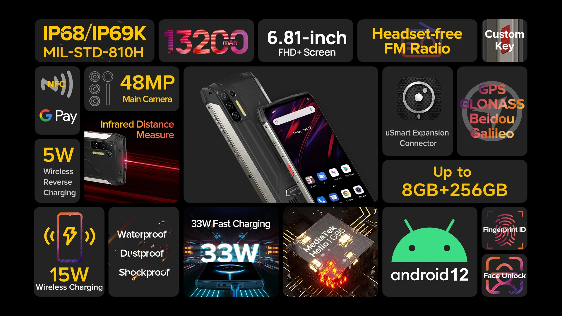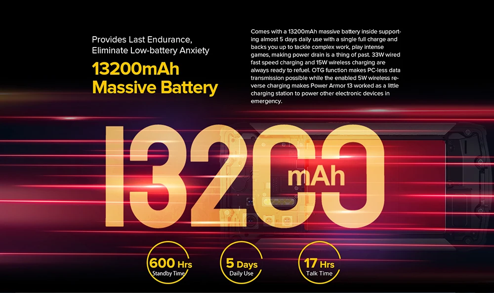 Comes with a 13200mAh massive battery inside supporting almost 5 days daily use with a single full charge and backs you up to tackle complex work, play intense games, making power drain is a thing of past. 33W wired fast speed charging and 15W wireless charging are always ready to refuel. OTG function makes PC-less data transmission possible while the enabled 5W wireless reverse charging makes Power Armor 13 worked as a little charging station to power other electronic devices in emergency.