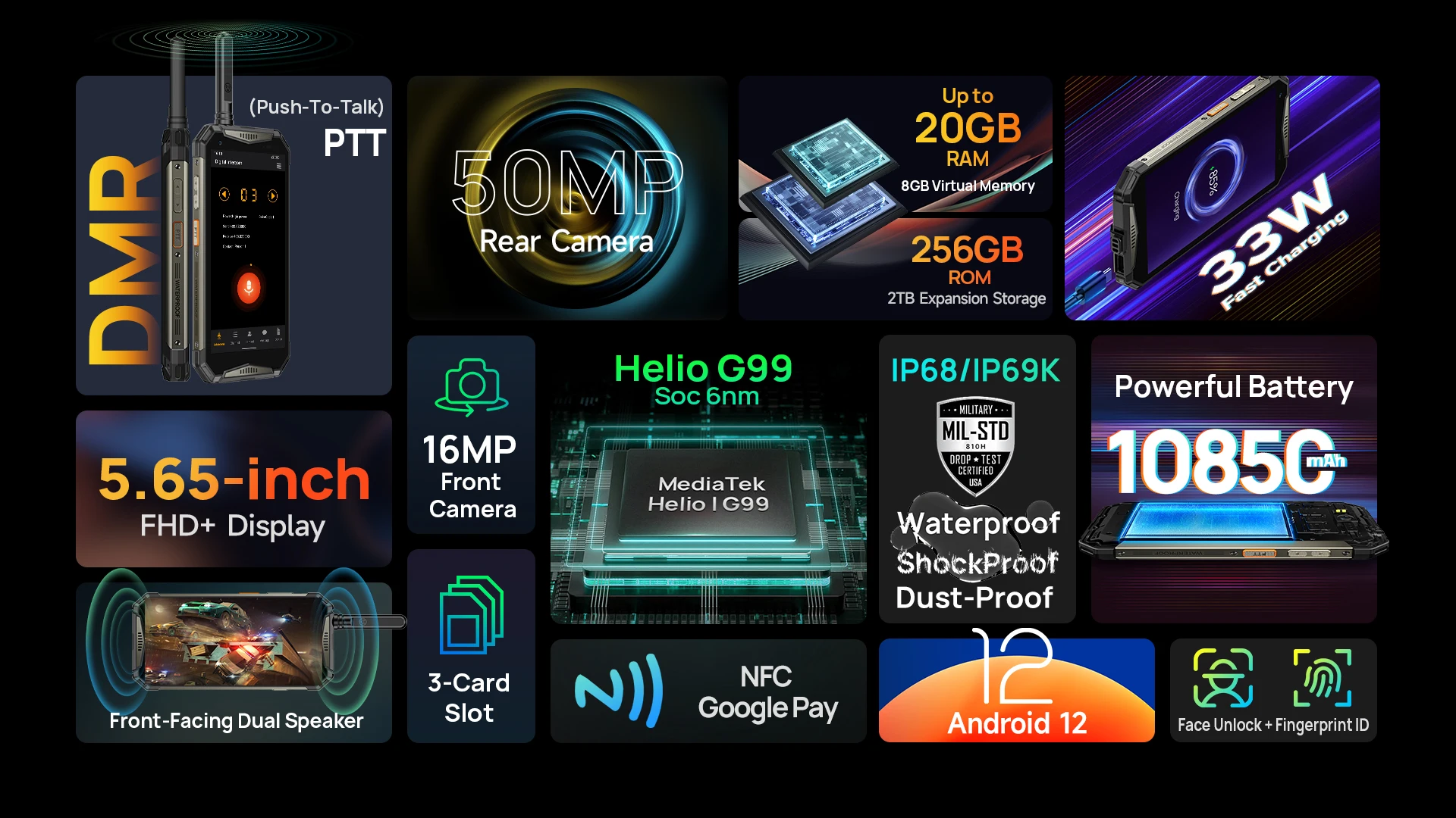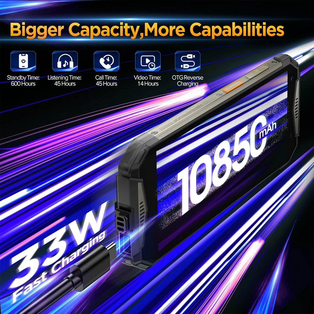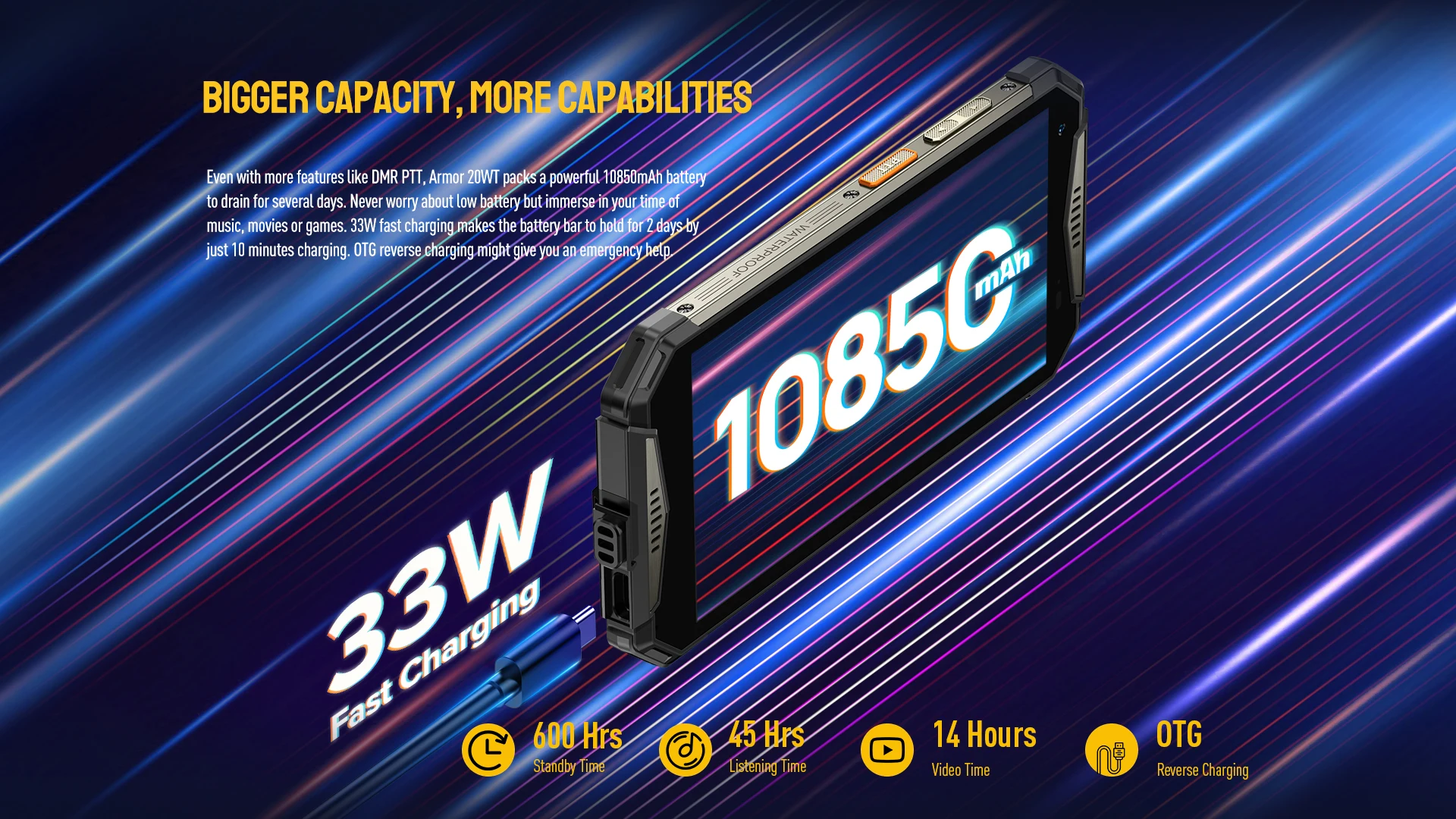 Even with more features like DMR PTT, Armor 20WT packs a powerful 10850mAh battery to drain for several days. Never worry about low battery but immerse in your time of music, movies or games. 33W fast charging makes the battery bar to hold for 2 days by just 10 minutes charging. OTG reverse charging might give you an emergency help.
