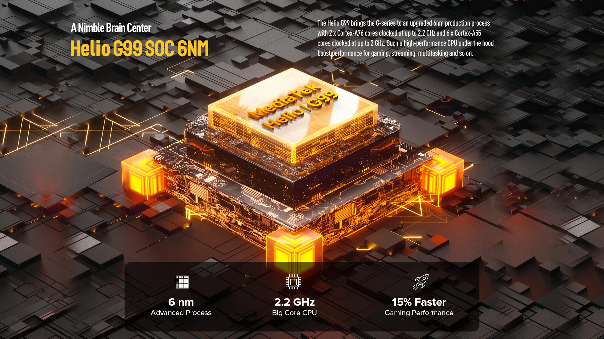 The Helio G99 brings the G-series to an upgraded 6nm production process with 2 x Cortex-A76 cores clocked at up to 2.2 GHz and 6 x Cortex-A55 cores clocked at up to 2 GHz. Such a high-performance CPU under the hood boost performance for gaming, streaming, multitasking and so on.