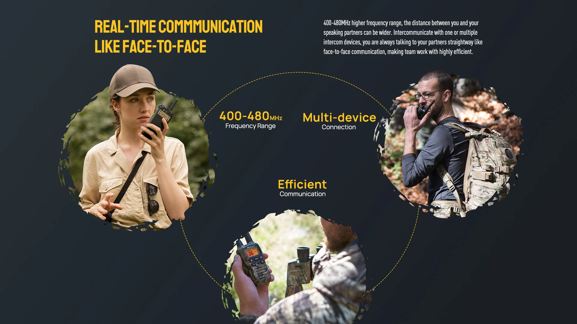 400-480MHz higher frequency range, the distance between you and your speaking partners can be wider. Intercommunicate with one or multiple intercom devices, you are always talking to your partners straightway like face-to-face communication, making team work with highly efficient.