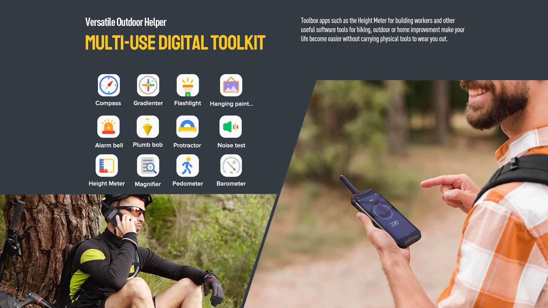 Toolbox apps such as the Height Meter for building workers and other useful software tools for hiking, outdoor or home improvement make your life become easier without carrying physical tools to wear you out.