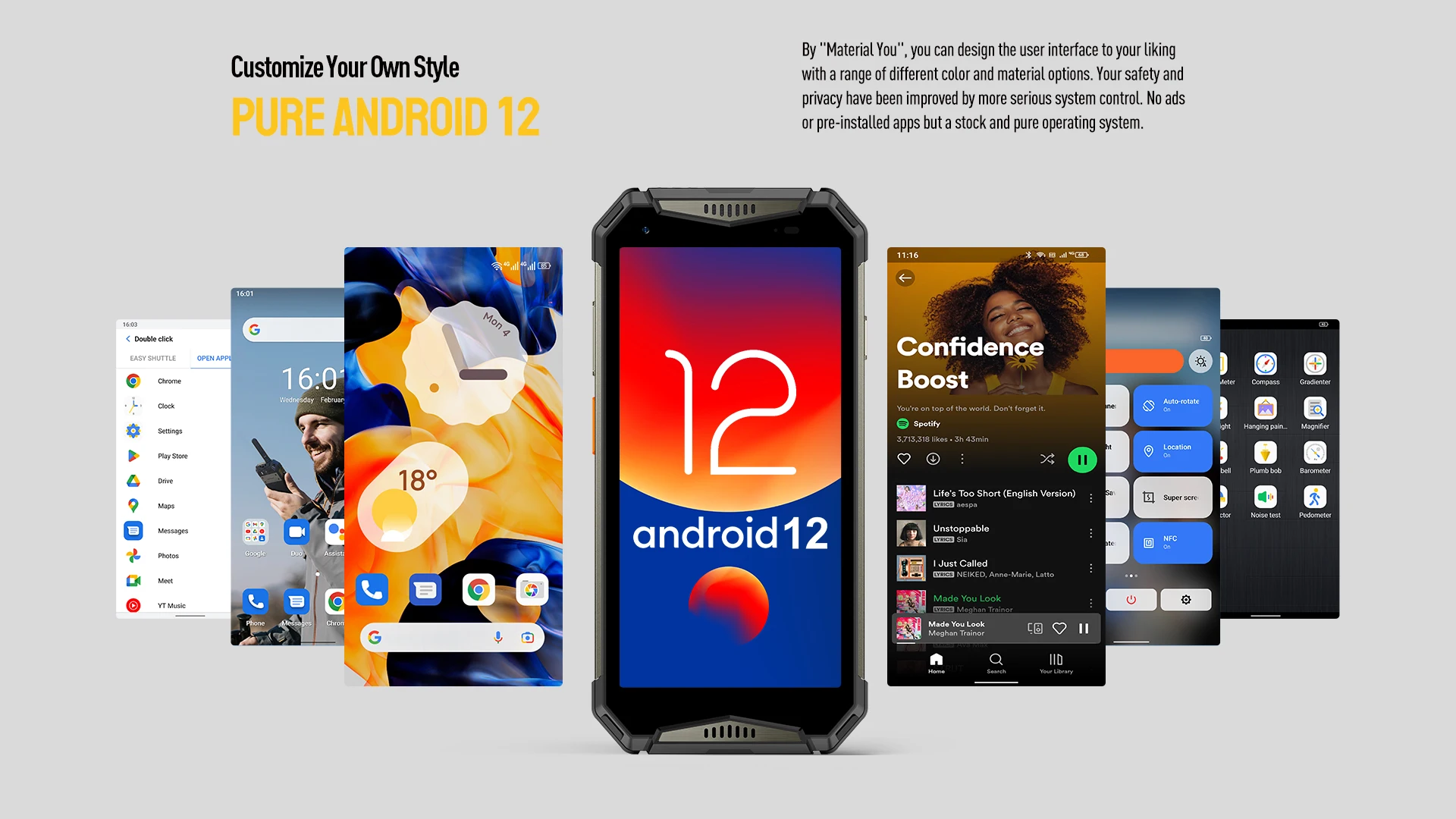 By "Material You", you can design the user interface to your liking with a range of different color and material options. Your safety and privacy have been improved by more serious system control. No ads or pre-installed apps but a stock and pure operating system.