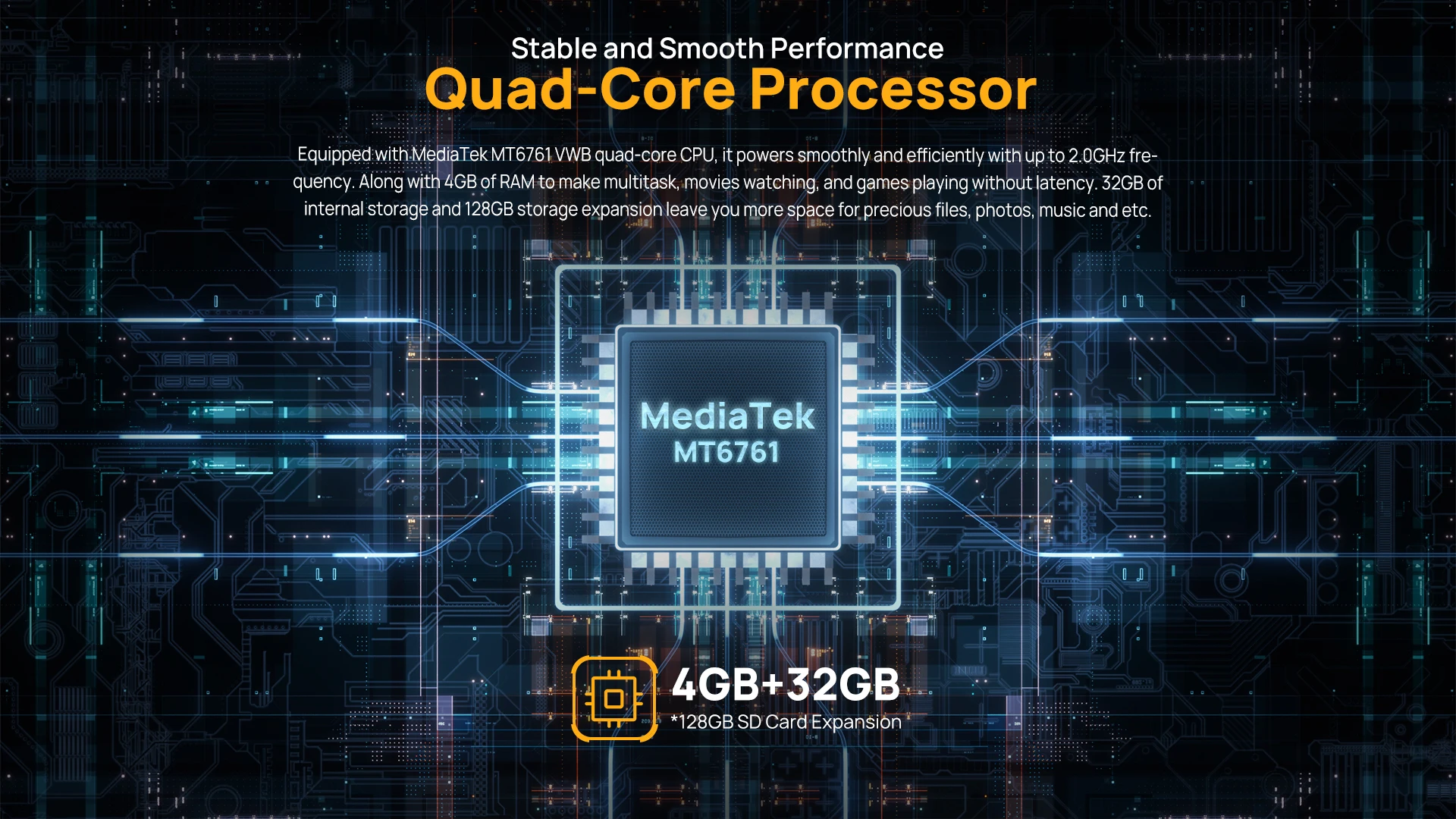 Equipado con La CPU de cuatro núcleos MediaTek MT6761 VWB, se alimenta suavemente y de manera eficiente con una frecuencia de hasta 2,0 GHz. Junto con 4GB de RAM para hacer multitarea, ver películas y jugar juegos sin latencia. 32GB de almacenamiento interno y 128GB de expansión de almacenamiento le dejan más espacio para preciosos archivos, fotos, música, etc.