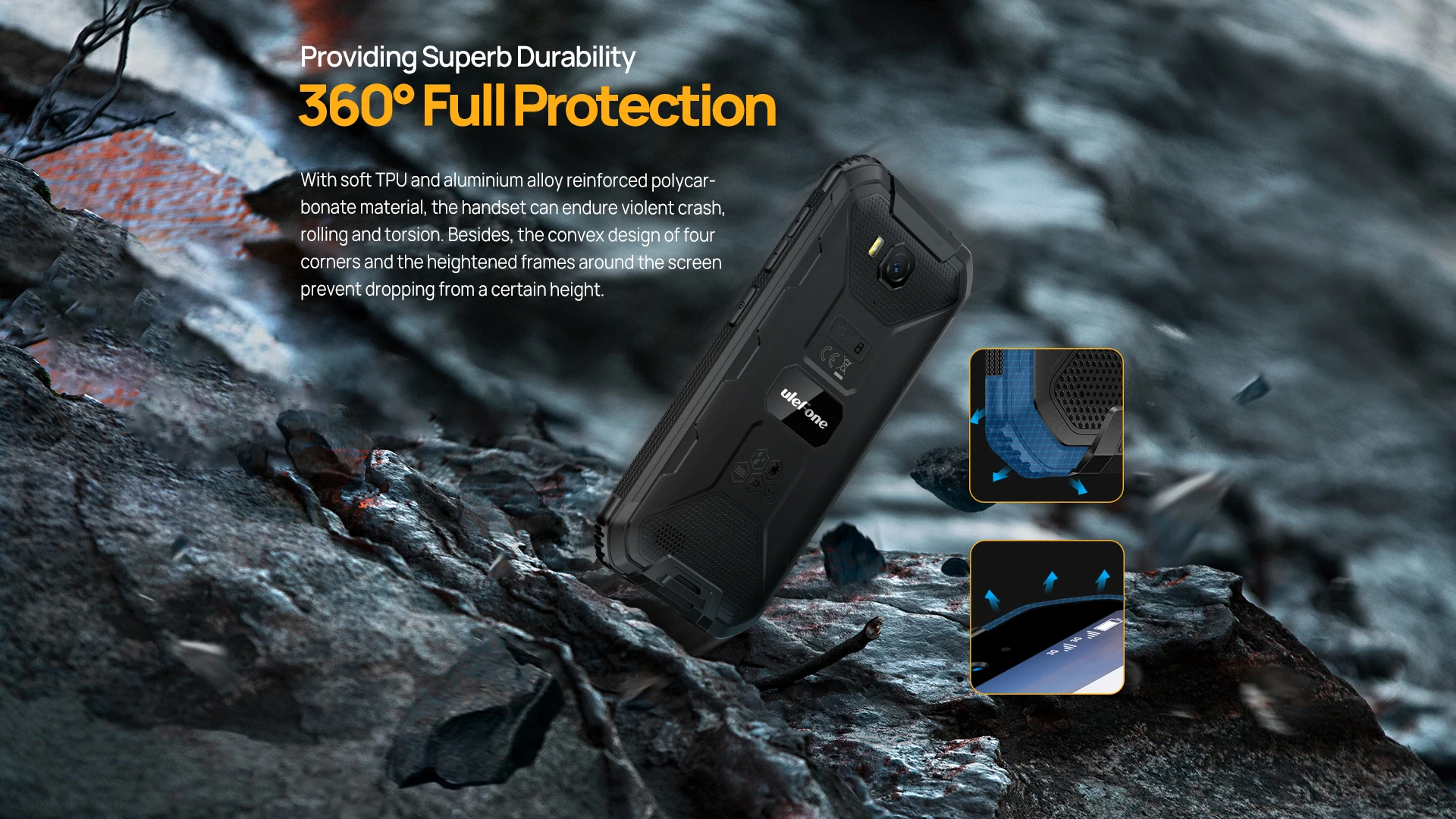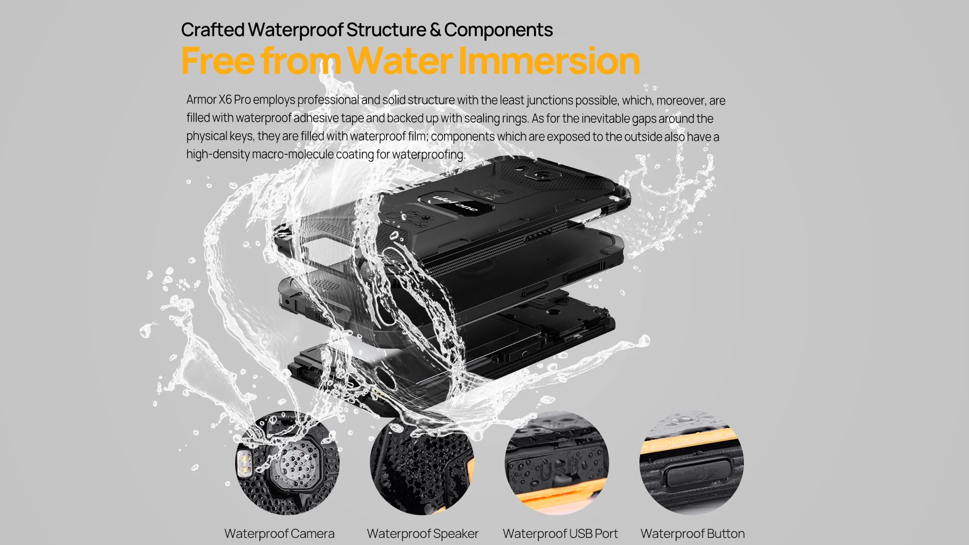 Armor X6 Pro emplea una estructura profesional y sólida con la menor cantidad de uniones posible, que, además, están llenas de cinta adhesiva impermeable y respaldadas con anillos de sellado. En cuanto a los inevitables huecos alrededor de las teclas físicas, están llenos de película impermeable; los componentes que están expuestos al exterior también tienen un recubrimiento de macromolécula de alta densidad para la impermeabilización.