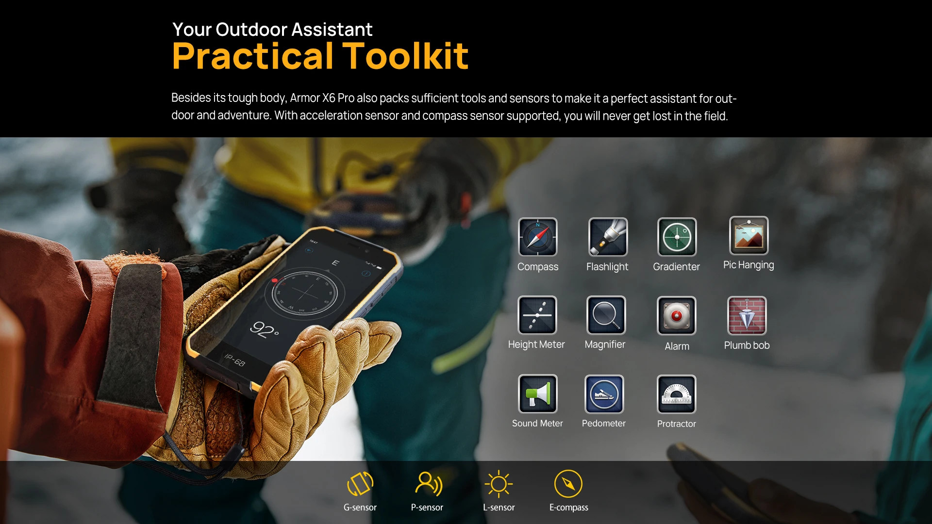 Además de su cuerpo resistente, Armor X6 Pro también incluye suficientes herramientas y sensores para que sea un asistente perfecto para el aire libre y la aventura. Con el sensor de aceleración y el sensor de brújula compatibles, nunca se perderá en el campo.