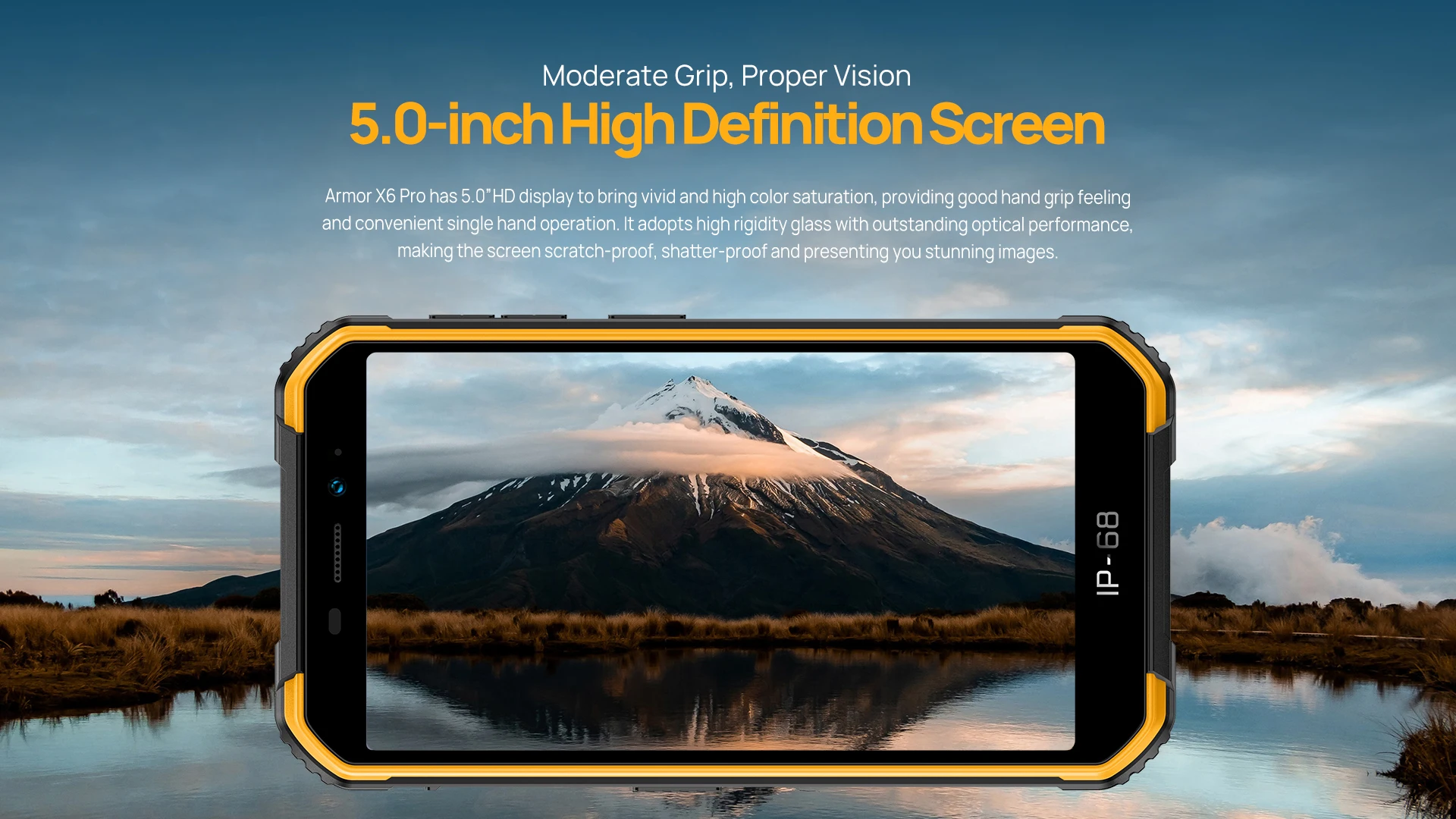 Armor X6 Pro tiene una pantalla HD de 5,0 "para brindar una saturación de color vívida y alta, proporcionando una buena sensación de agarre y una operación conveniente con una sola mano. Adopta vidrio de alta rigidez con un rendimiento óptico sobresaliente, lo que hace que la pantalla sea a prueba de arañazos, roturas y le presente imágenes impresionantes.