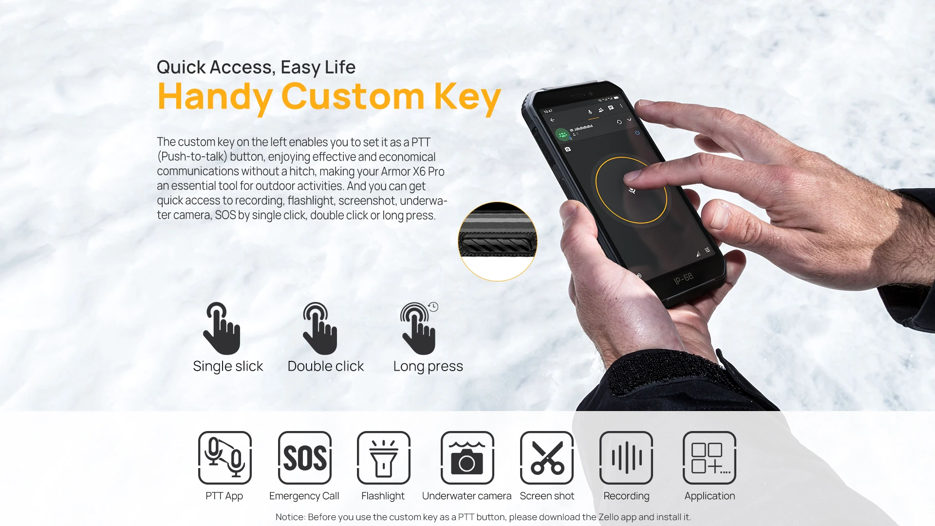 La tecla personalizada de la izquierda le permite configurarlo como un botón PTT (Push-to-Talk), disfrutando de comunicaciones efectivas y económicas sin problemas, haciendo de su Armor X6 Pro una herramienta esencial para actividades al aire libre. Y puede obtener acceso rápido a la grabación, linterna, captura de pantalla, cámara subacuática, SOS con un solo clic, doble clic o pulsación larga.