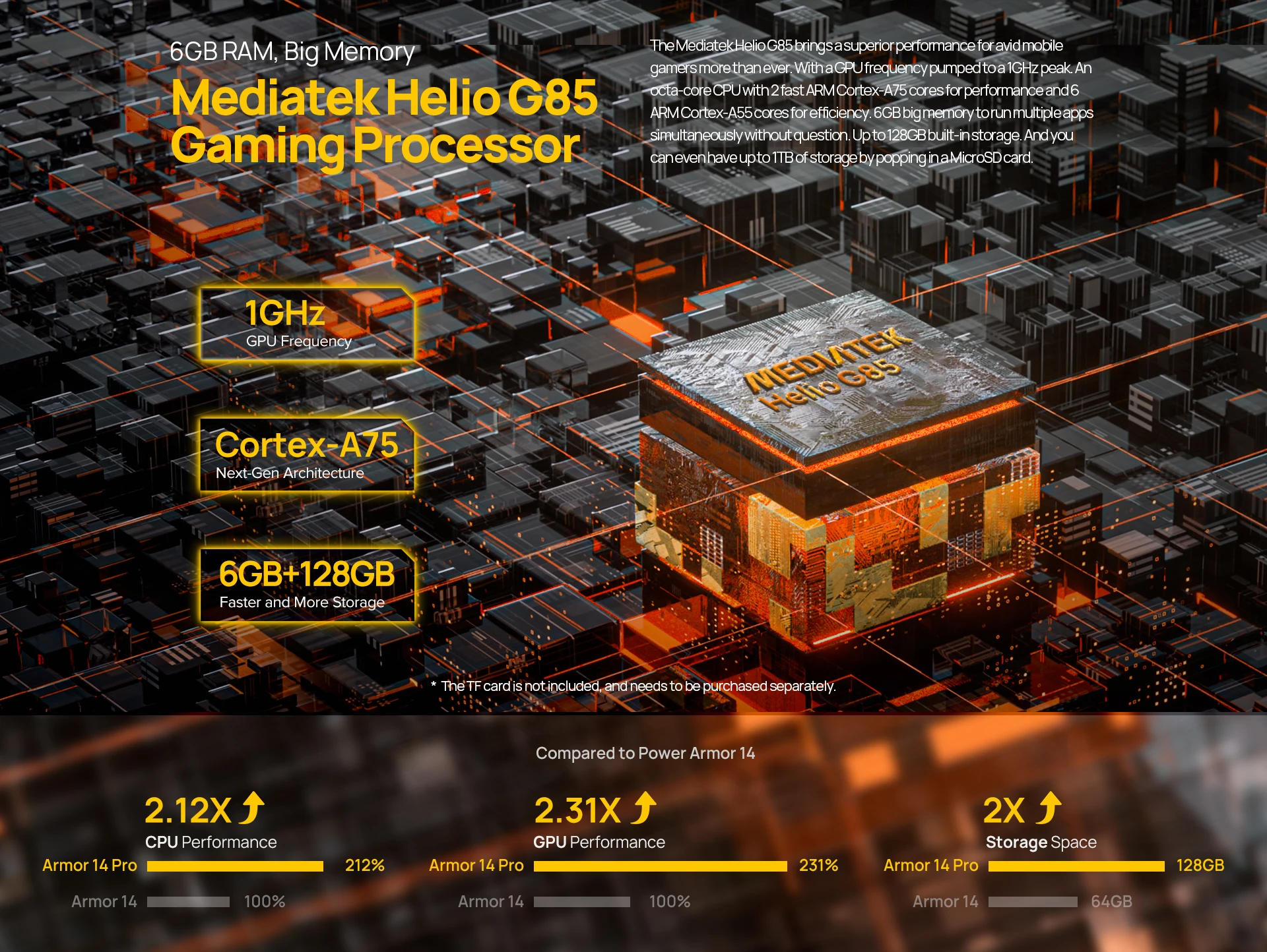 El Mediatek Helio G85 ofrece un rendimiento superior para los jugadores móviles más que nunca. Con una frecuencia de GPU bombeada a un pico de 1GHz. Una CPU octa-core con 2 núcleos ARM rápidos para un mayor rendimiento y 6 núcleos ARM para una mayor eficiencia. Gran memoria de 6GB para ejecutar múltiples aplicaciones simultáneamente sin duda. Hasta 128GB de almacenamiento incorporado. E incluso puede tener hasta 1TB de almacenamiento introduciendo una tarjeta MicroSD.
