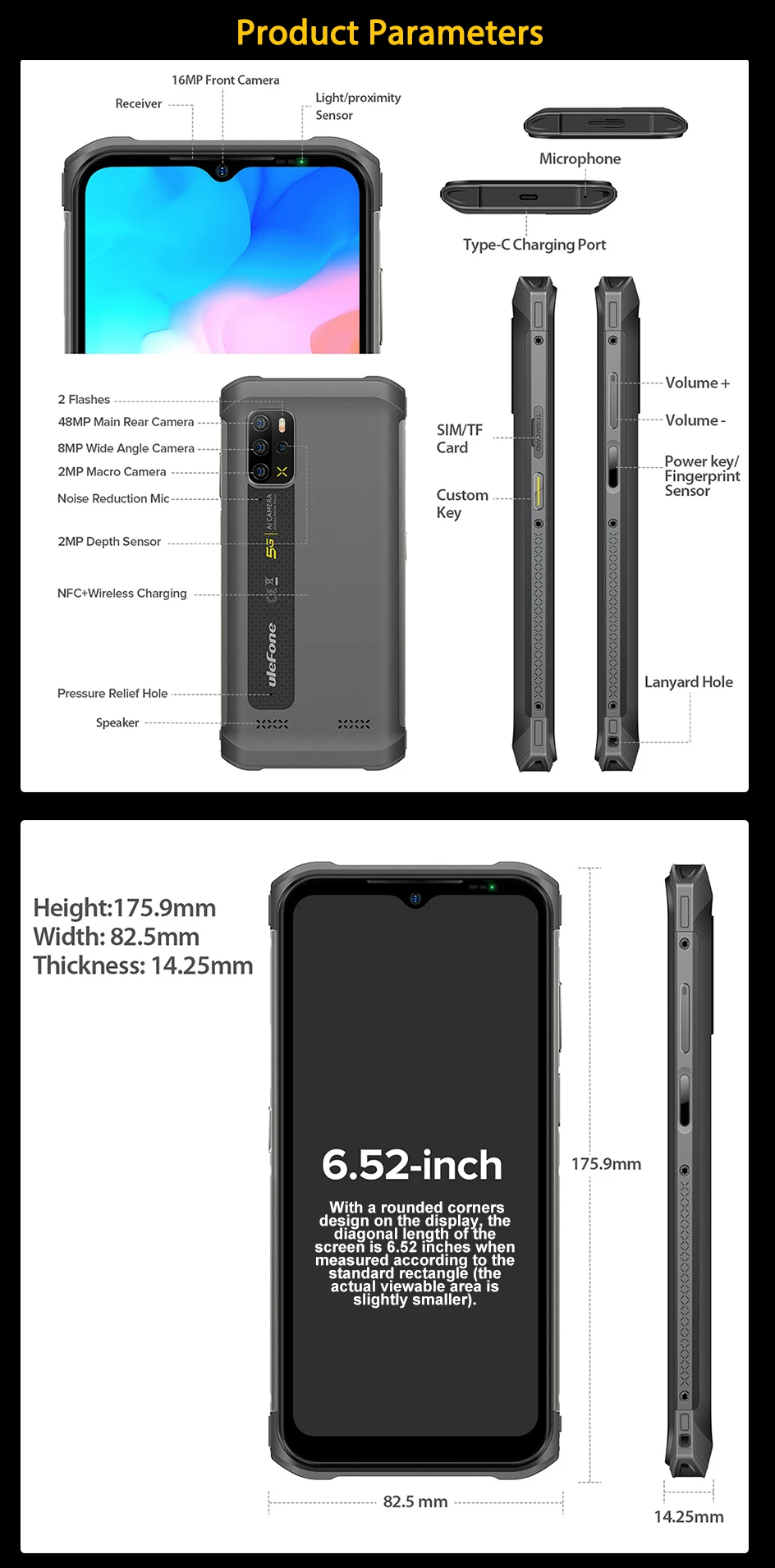 * Con un diseño de esquinas redondeadas en la pantalla, la longitud diagonal de la pantalla es de 6,52 pulgadas cuando se mide de acuerdo con el rectángulo estándar (el área visible real es ligeramente más pequeña).