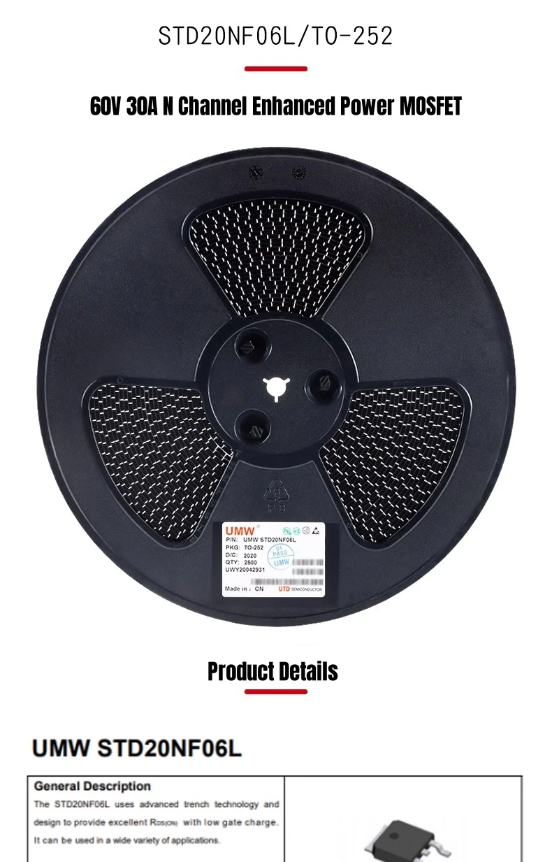 Comprar UMW-MOSFET de potencia mejorada, Original, Original, STD20NF06L TO-252, 60V/30A, Canal N, 5 piezas-1 lote