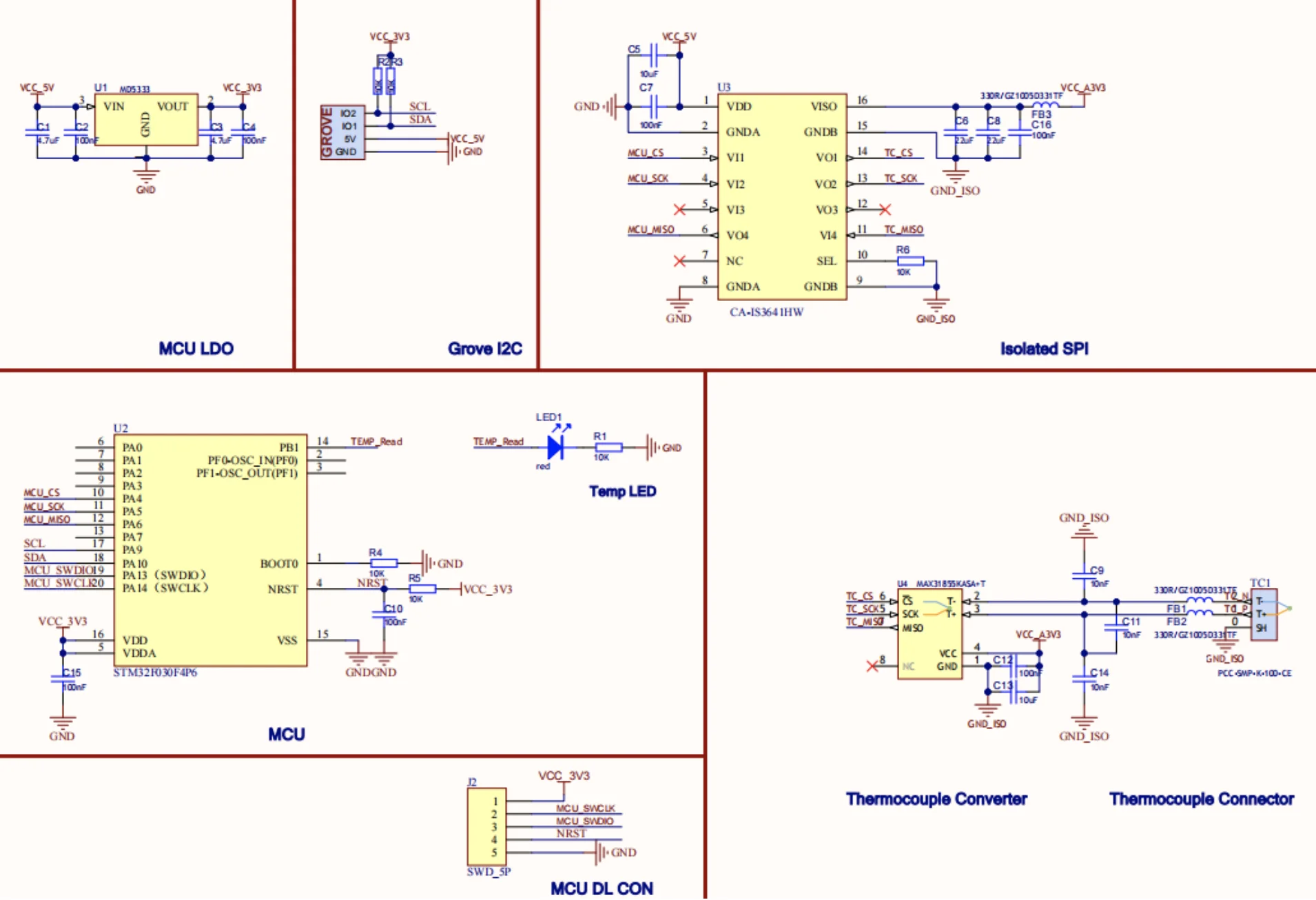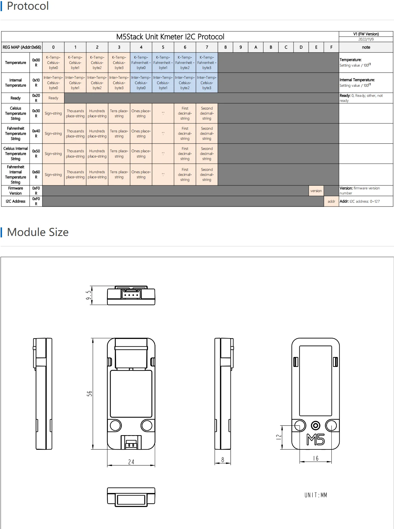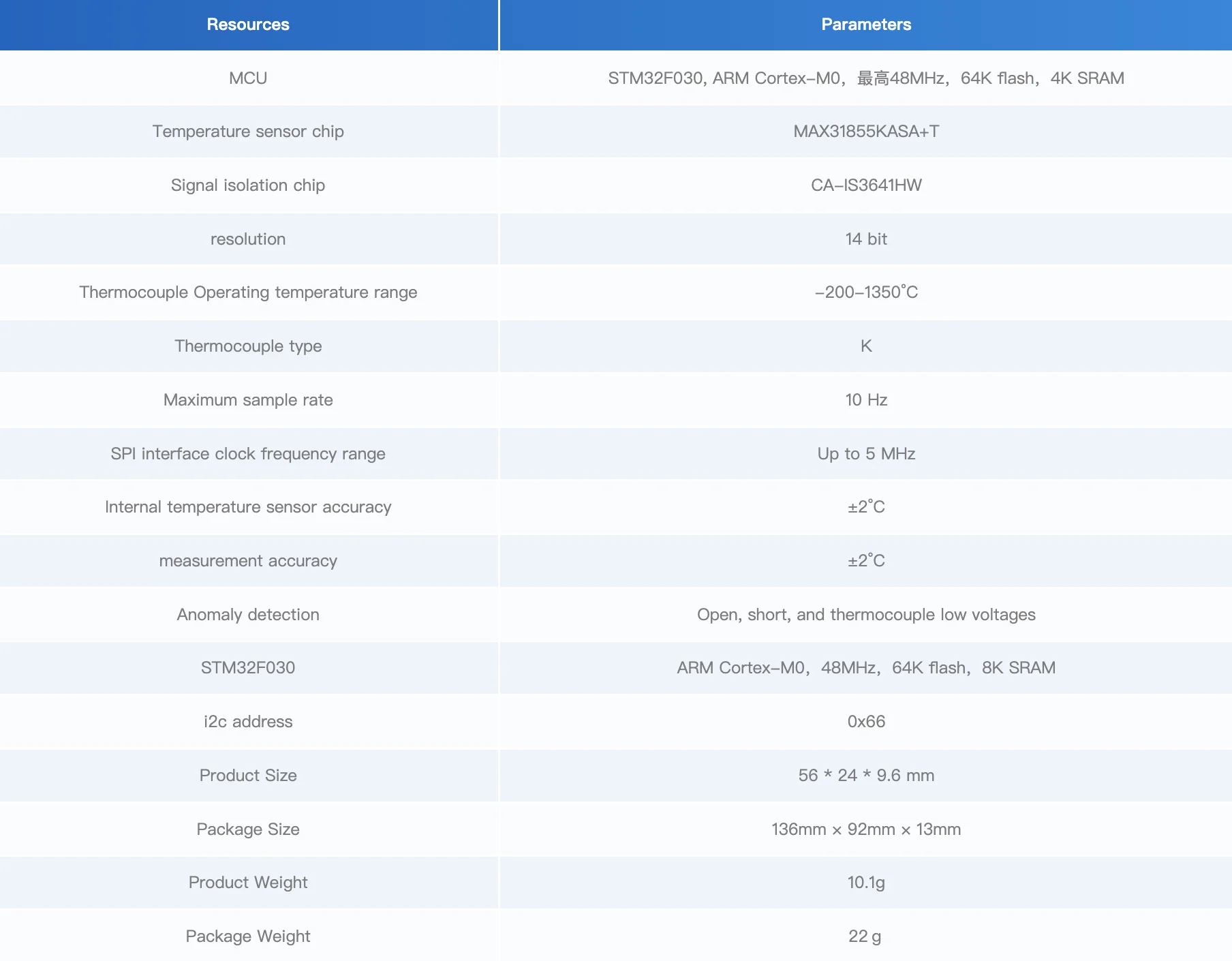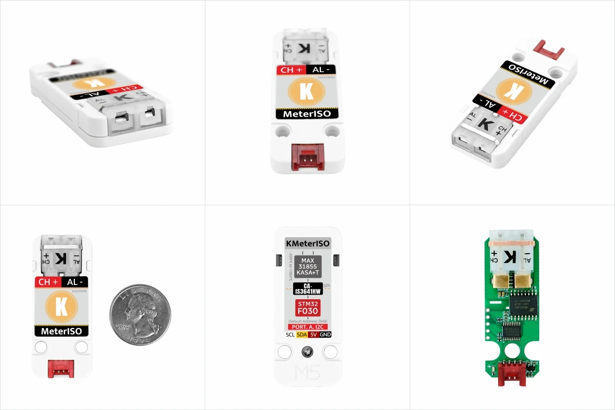 KMeterISO unitis an integrated K-type thermocouple sensor unit that integrates the functions of "acquisition + isolation + communication", using STM32F030+MAX31855KASA+T 14bit thermocouple digital conversion chip scheme to achieve high-precision temperature acquisition and conversion, MCU using STM32F030 to realize data acquisition and I2C communication interface, using CA-IS3641HW as a signal isolator. The unit supports access to thermocouple probes with a measurement range of -200°C to 1350°C, and adopts a universal standard K-type flat interface, which is convenient for subsequent replacement of different measuring probes to match different needs. This module is widely used in application scenarios such as temperature collection, control, and monitoring in industrial automation, instrumentation, power and electrical, heat treatment and other fields.