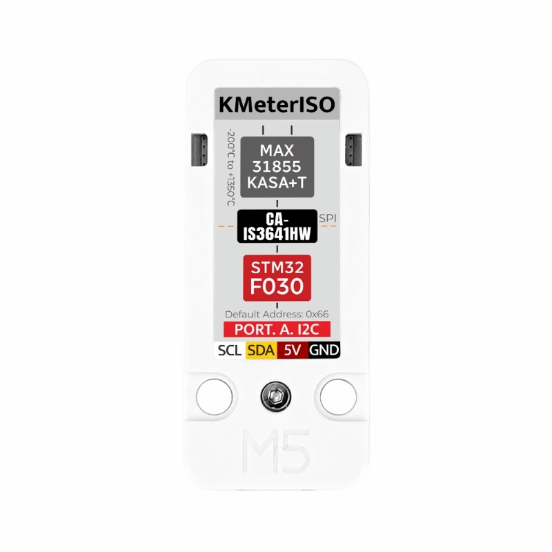 KMeterISO unitis an integrated K-type thermocouple sensor unit that integrates the functions of "acquisition + isolation + communication", using STM32F030+MAX31855KASA+T 14bit thermocouple digital conversion chip scheme to achieve high-precision temperature acquisition and conversion, MCU using STM32F030 to realize data acquisition and I2C communication interface, using CA-IS3641HW as a signal isolator. The unit supports access to thermocouple probes with a measurement range of -200°C to 1350°C, and adopts a universal standard K-type flat interface, which is convenient for subsequent replacement of different measuring probes to match different needs. This module is widely used in application scenarios such as temperature collection, control, and monitoring in industrial automation, instrumentation, power and electrical, heat treatment and other fields.