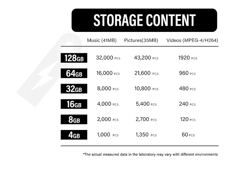 ● Velocidad de escritura: 10 Mb/s – 20 Mb/s. La tasa de rendimiento depende de los diferentes sistemas operativos disponibles y de los distintos flashes adoptados, por lo que la velocidad puede ser diferente.
