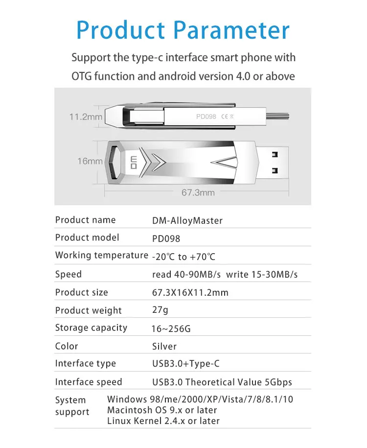 Descripciones:-La apariencia de un diseño de metal elegante, textura popular duradera.-Diseño de rotación de 360 grados para proteger la gama completa de interfaz, evitar daños descuidados.-Diseño personalizado elegante, la interfaz USB 3,0 tipo C 3,1, permite una transferencia de datos de gran velocidad-velocidad de lectura de hasta 140 MB/s, compatible con USB 2,0.-Fácil de completar las funciones de almacenamiento y transporte.-Deja que los archivos en el teléfono logren una visualización más directa del ordenador compartido.-Admite múltiples dispositivos, como tabletas, teléfonos, ordenadores.-Es compatible con USB 3,1, pero también mejora en gran medida la velocidad de transmisión.Color: plataPeso del paquete: 0.038 kgTamaño del producto (largo x ancho x Alto): 6,73x1,6x1,12 cm/2,64x0,63x0,44 pulgadasTamaño del paquete (largo x ancho x alto): 12,00x10,00x1,40 cm/4,40x3,93x0,55 pulgadasContenido del paquete:1 unidad flash DM PD096 OTG tipo C USB 3,0Nota: No todos los teléfonos inteligentes pueden usar esta unidad flash, se puede usar en los teléfonos inteligentes compatibles con la función OTG y tiene una interfaz tipo C, asegúrese de que antes de realizar el pedido, O también puede preguntarnos si no puede asegurarse, ¡Muchas gracias!