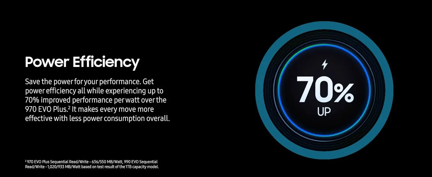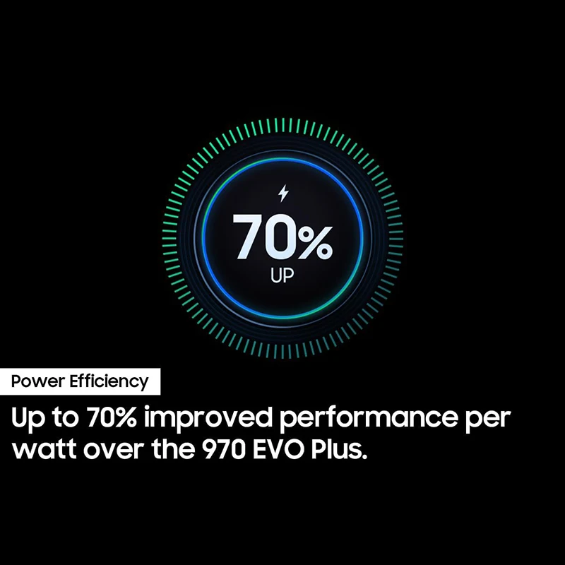EFICIENCIA ENERGÉTICA: Ahorre energía para su rendimiento. Obtenga Eficiencia Energética mientras experimenta hasta un 70% de rendimiento mejorado por vatio en comparación con el 970 EVO Plus.* Hace que cada movimiento sea más efectivo con menos consumo de energía en general.