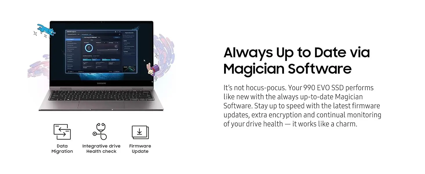 SIEMPRE AL DIA A TRAVÉS DEL SOFTWARE MAGICIAN: No es hocus pocus. Su SSD 990 EVO funciona como nuevo con el software Magician siempre actualizado. Manténgase al día con las últimas actualizaciones de firmware, cifrado adicional y monitoreo continuo de la salud de su unidad funciona a las mil maravillas.