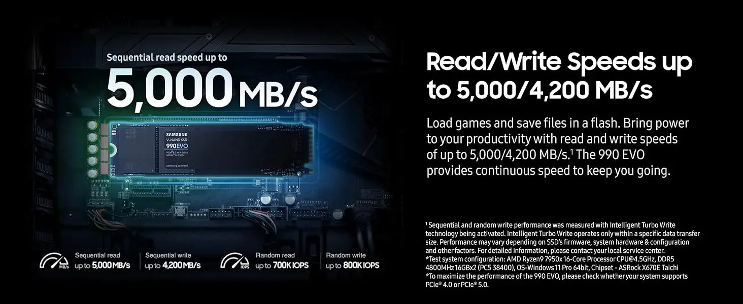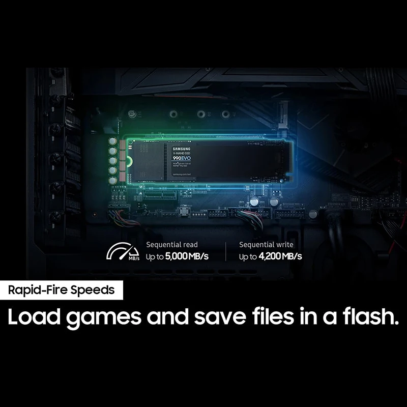 Velocidades de lectura/escritura de hasta 5.000/4.200 MB/s: carga juegos y guarda archivos en un instante. Aporta potencia a tu productividad con velocidades de lectura y escritura de hasta 5.000/4.200 MB/s.* El 990 EVO proporciona velocidad continua para mantenerte en marcha.