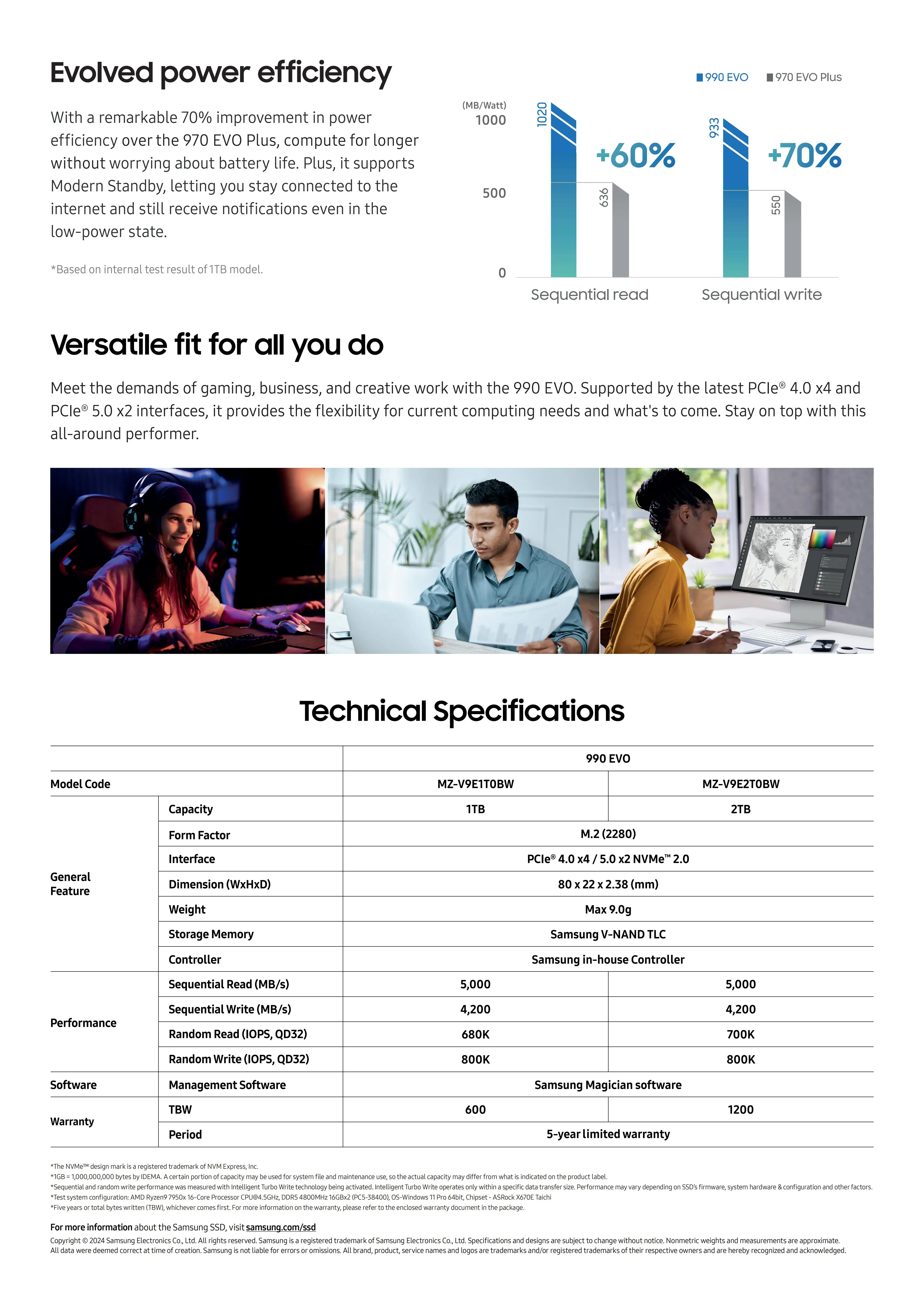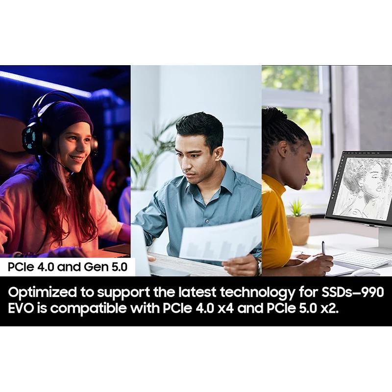 INTERFAZ PCIe 5,0: optimizado para soportar la última tecnología para SSD 990 EVO es compatible con PCIe 4,0x4 y PCIe 5,0x2. Esto significa que obtiene más ancho de banda y un mayor procesamiento de datos y rendimiento. En general, hace más para admitir un almacenamiento sin problemas con menos consumo de energía.