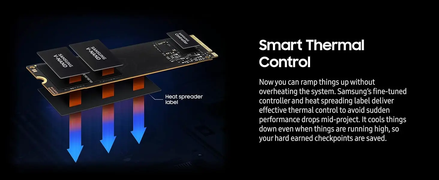 CONTROL TÉRMICO INTELIGENTE: ahora puede aumentar las cosas sin sobrecalentar el sistema. El controlador afinado de Samsung y la etiqueta de propagación de calor brindan un control térmico efectivo para evitar caídas repentinas de rendimiento a mitad del proyecto. Refresca las cosas incluso cuando están a la altura, por lo que se guardan los puntos de control ganados con tanto esfuerzo.