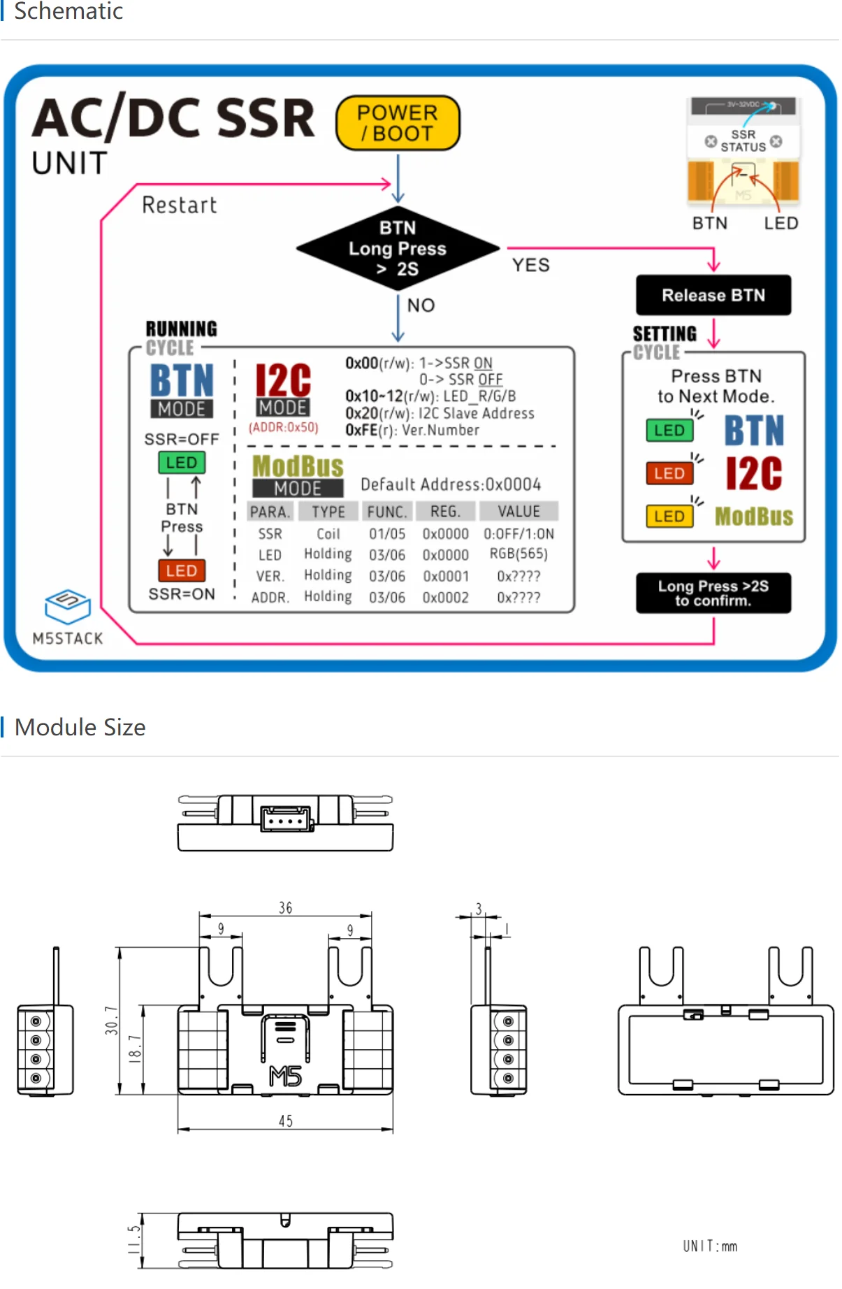 La unidad ACSSR es un kit de controlador de relé de estado sólido monofásico de CC a CC, viene con un relé de estado sólido monofásico + placa controladora ESP32C3. Admite modos de operación de control de teclas, esclavo I2C y redes Modbus. LED RGB programable integrado a todo color para indicación de estado, claro para operar.