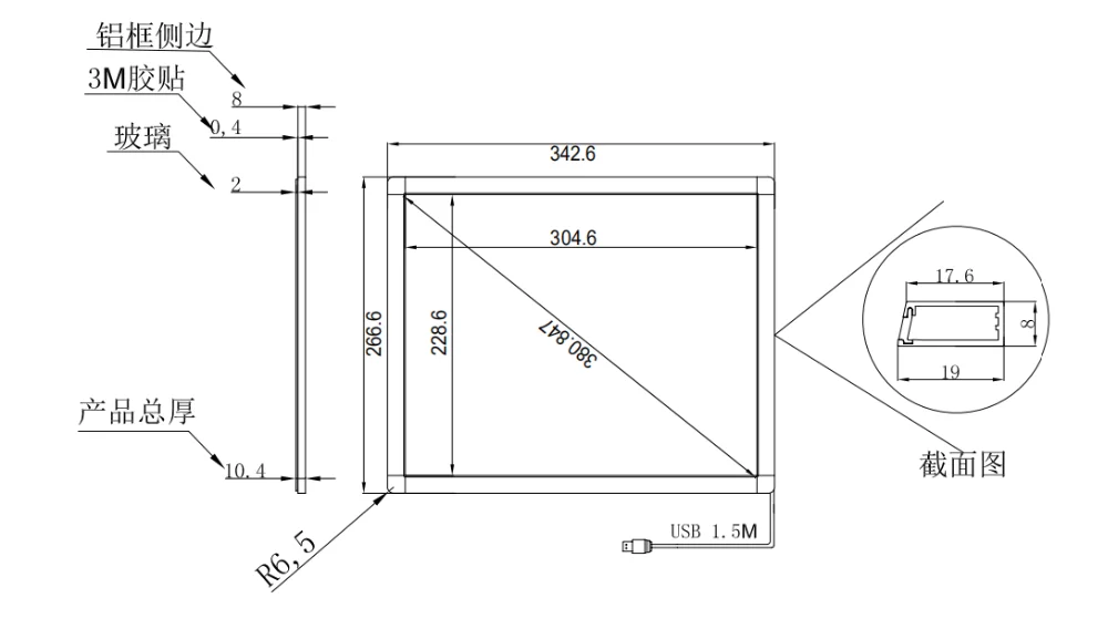 Pantalla multitáctil IR de 15 pulgadas y 10 puntos Dibujo de dimensiones del producto:
