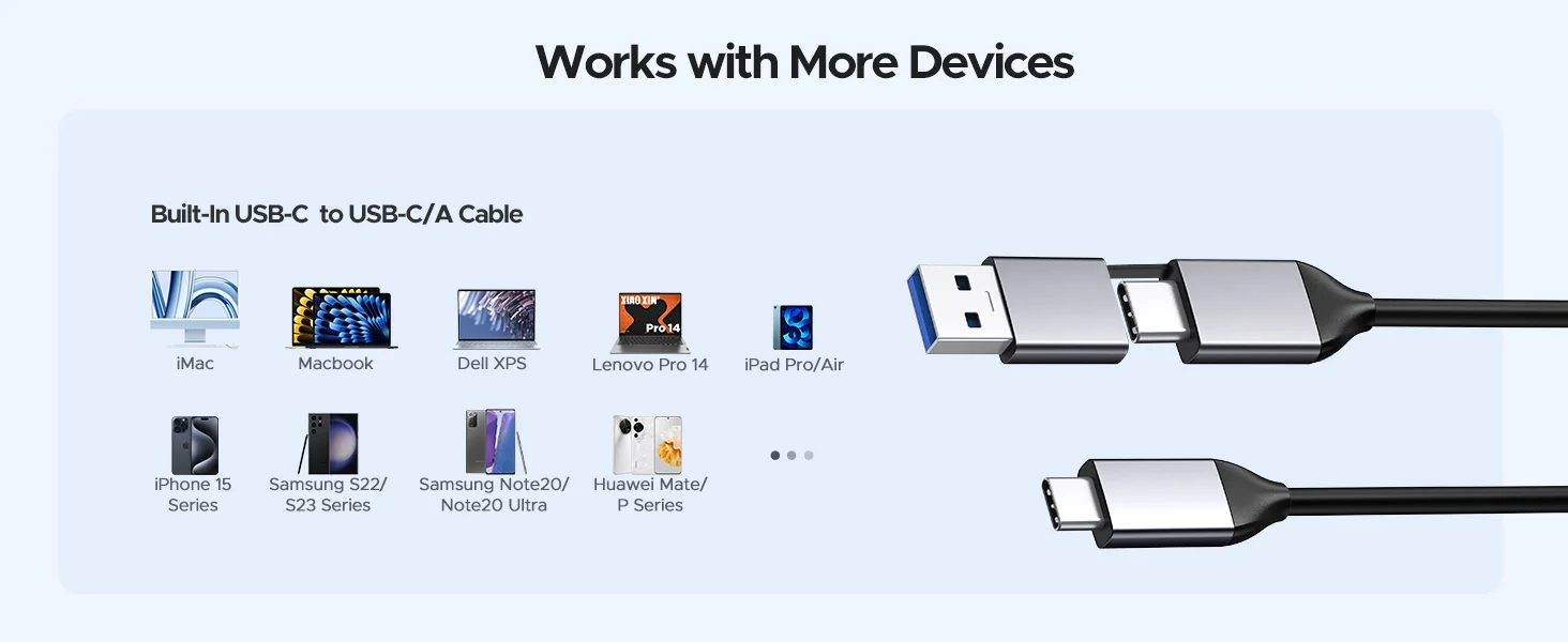 Adapte dispositivos USB-C y USB-A (teléfonos inteligentes, PC, portátiles y tabletas, etc.).Plug and play para una variedad de sistemas (Android, IOS, macOS, Windows)