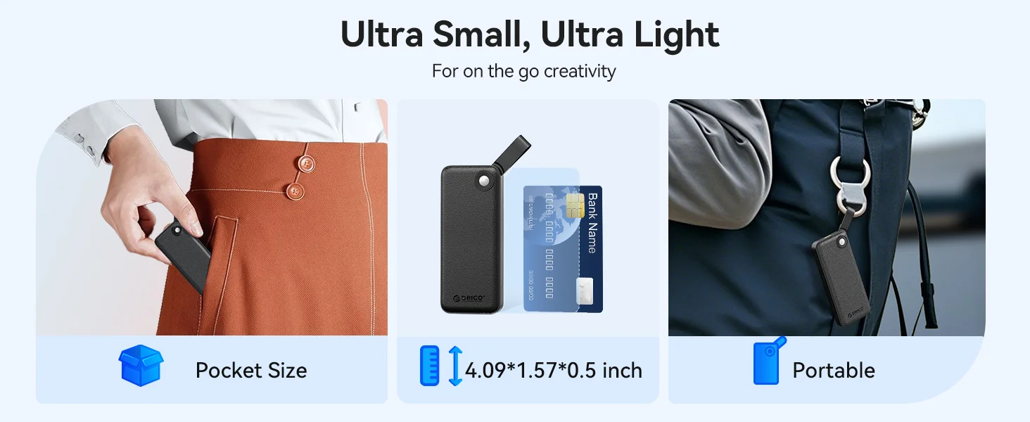 Con solo 4,09 x 1,57 x 0,5 pulgadas y un peso de solo 0,08 libras, este SSD externo es ultraportátil.La correa de silicona le permite sujetarlo de forma segura a su mochila o equipo para un fácil acceso.