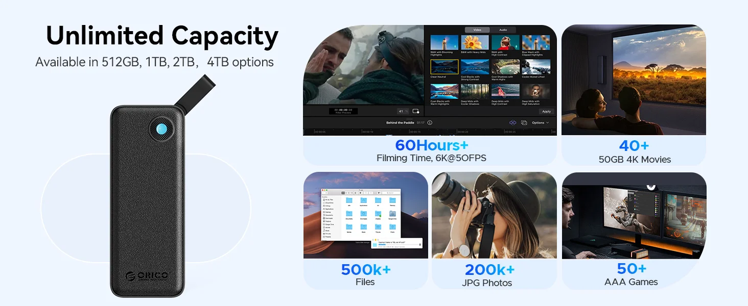 Este SSD portátil B5pro proporciona 1 TB de espacio para almacenar fotos, videos, activos de diseño y copias de seguridad, lo que garantiza que nunca se quedará sin almacenamiento, incluso para proyectos grandes o uso prolongado.