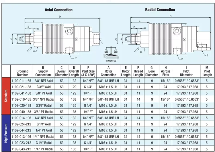 1109-010-165 1109-020-188 Serie 1109 Uniones giratorias montadas en rotor para servicio de refrigerante con funcionamiento en seco 1109 010 165