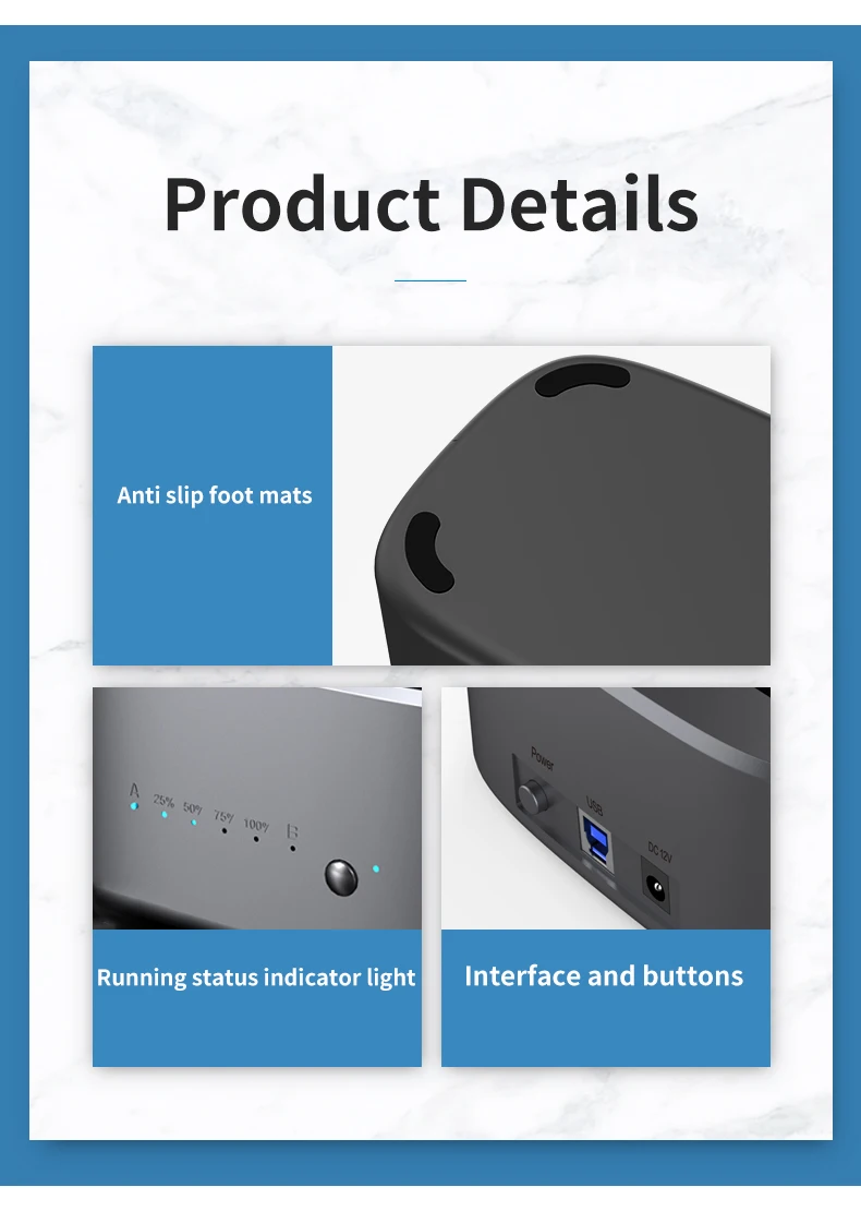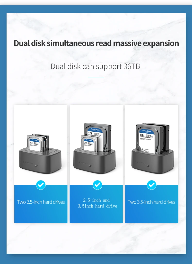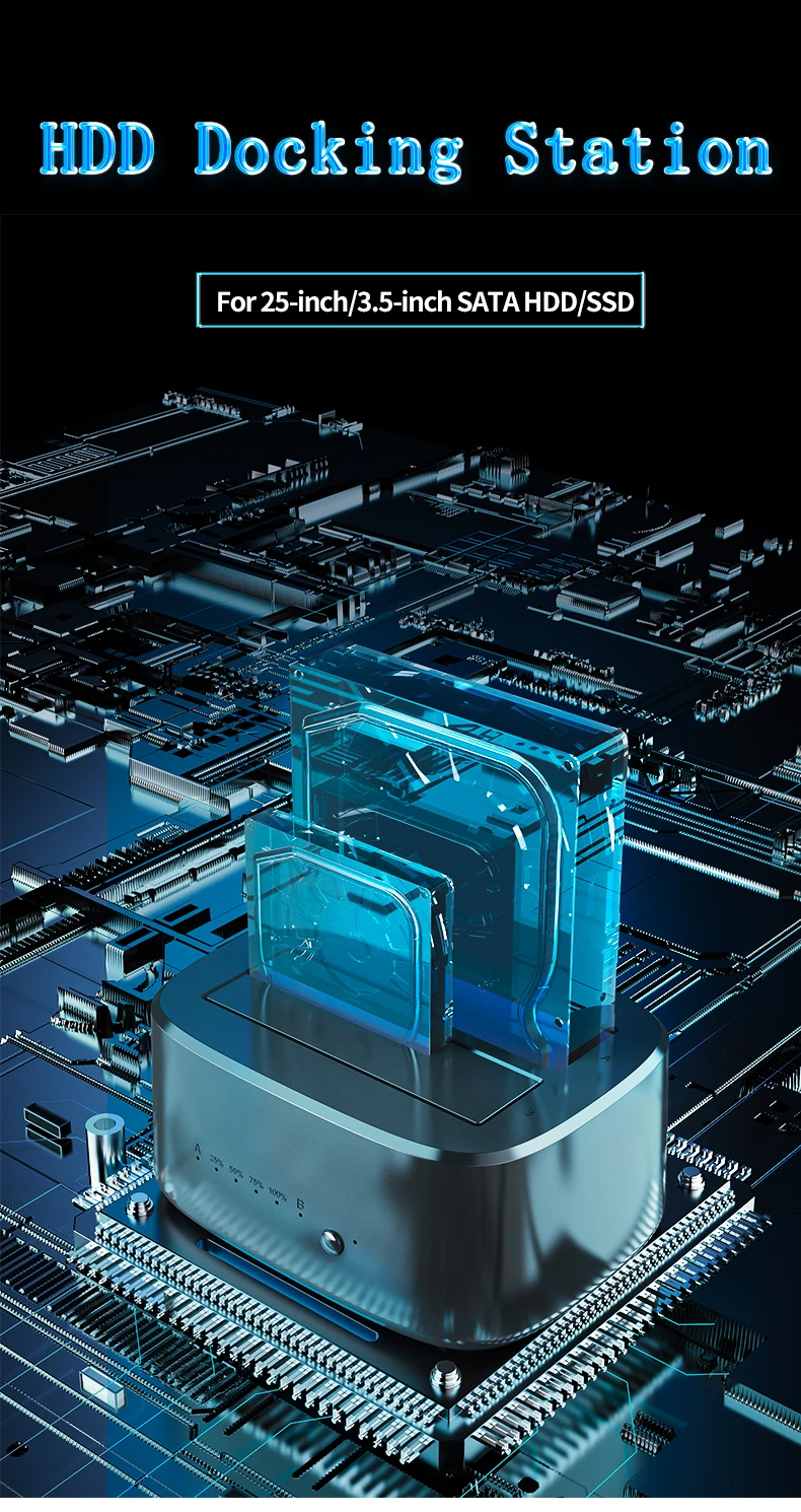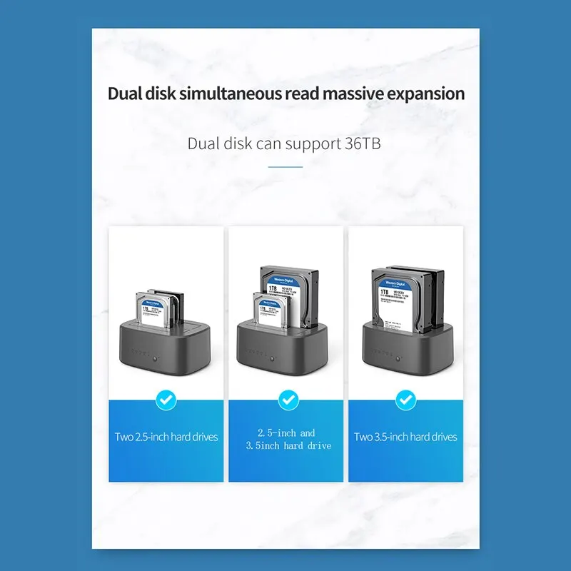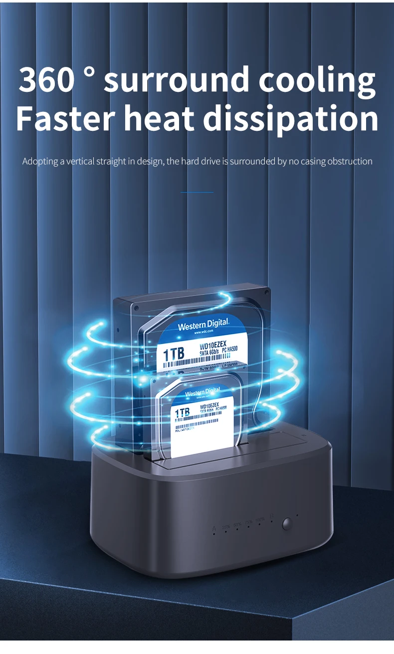 Esta estación de acoplamiento compatible con 2,5 pulgadas o 3,5 pulgadas HDD/SSD de hasta 16TB por Bahía, proporciona una forma más conveniente de transmitir datos entre su disco duro y la computadora a través de un puerto USB disponible.